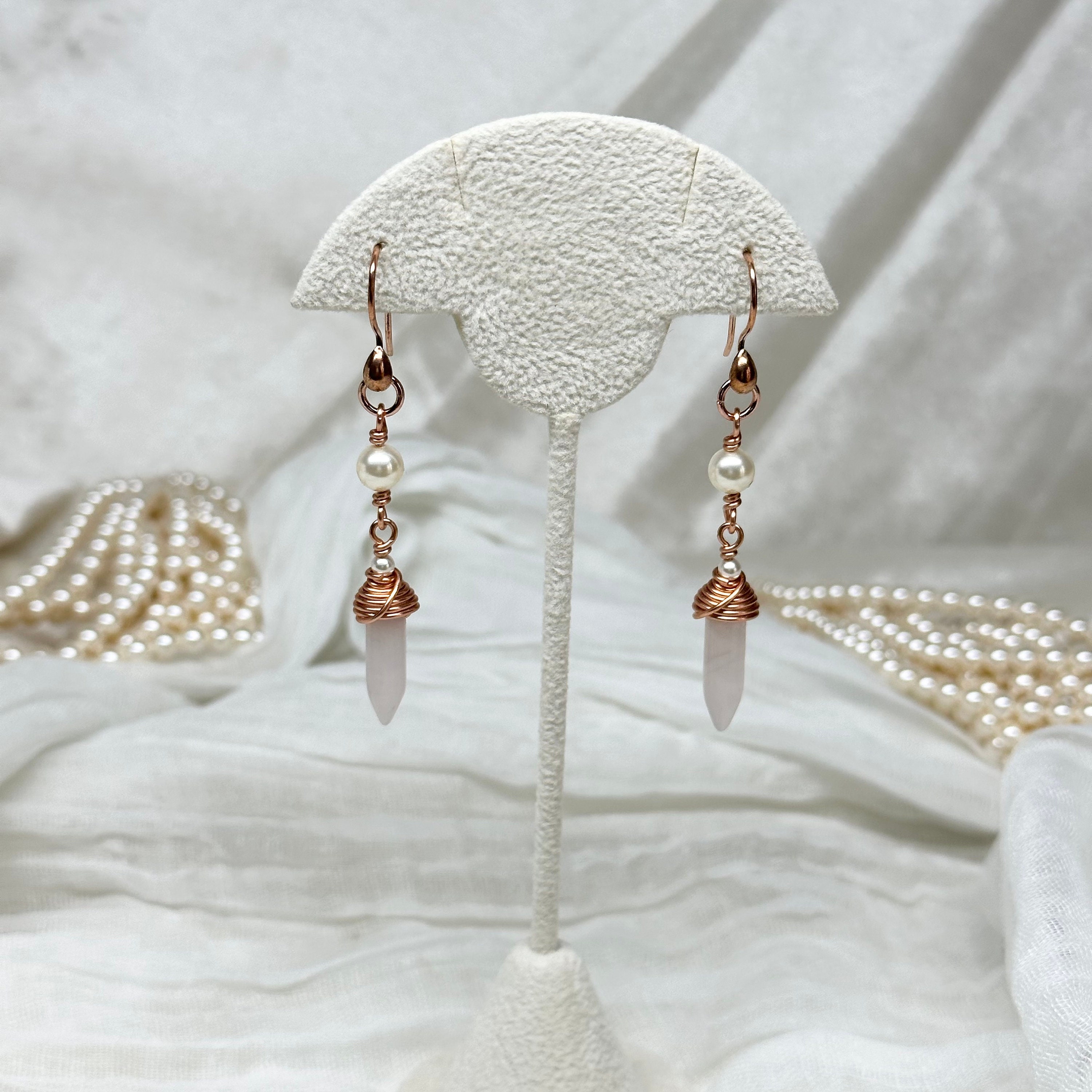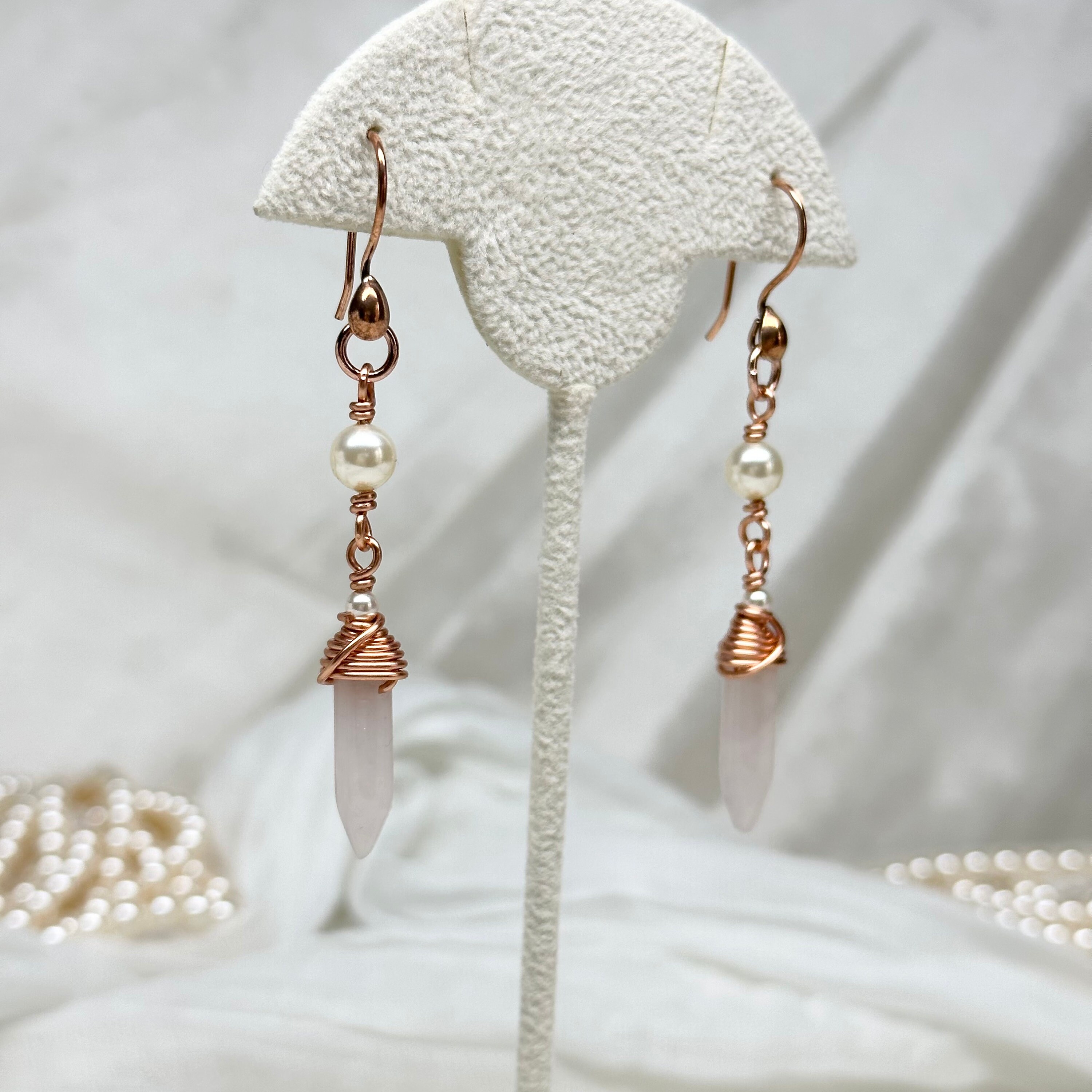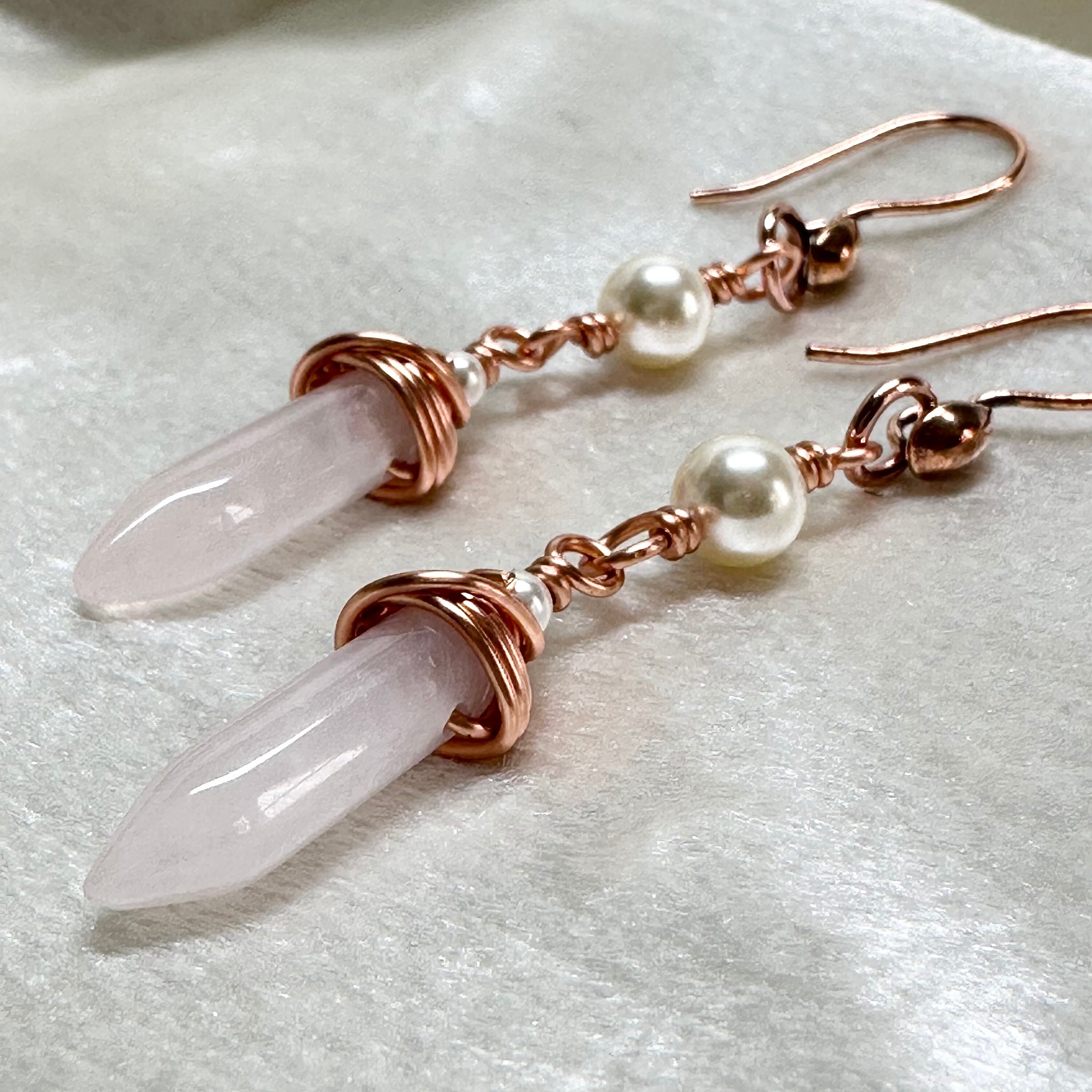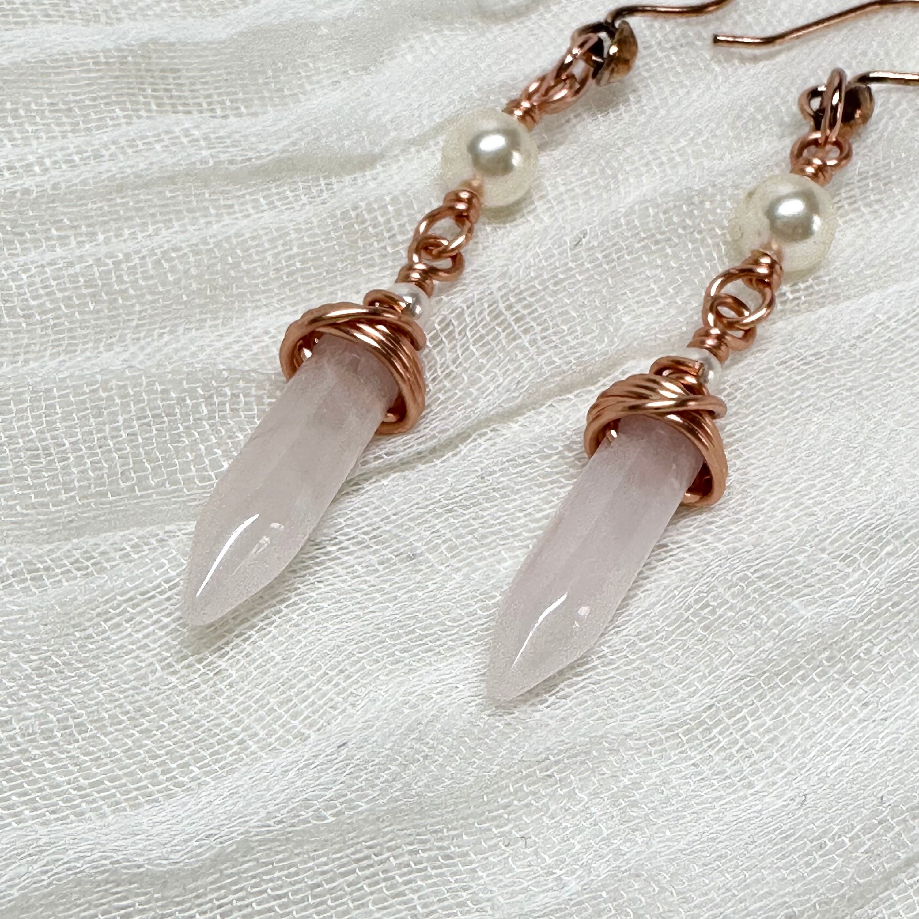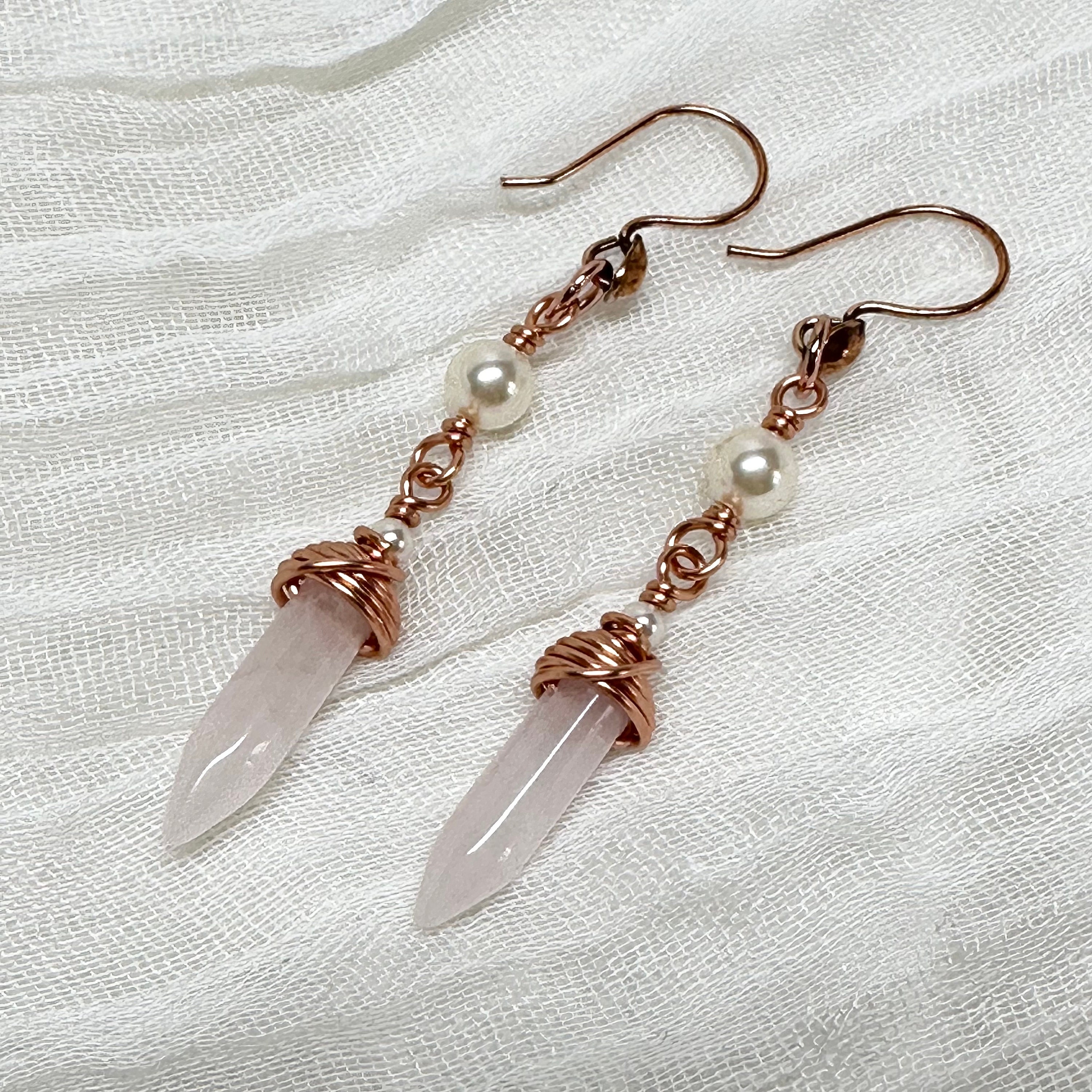 Gorgeous soft-pink colored rose quartz hand-wrapped in copper wire with professional quality Austrian crystal pearl accents. Let them calm and balance you!