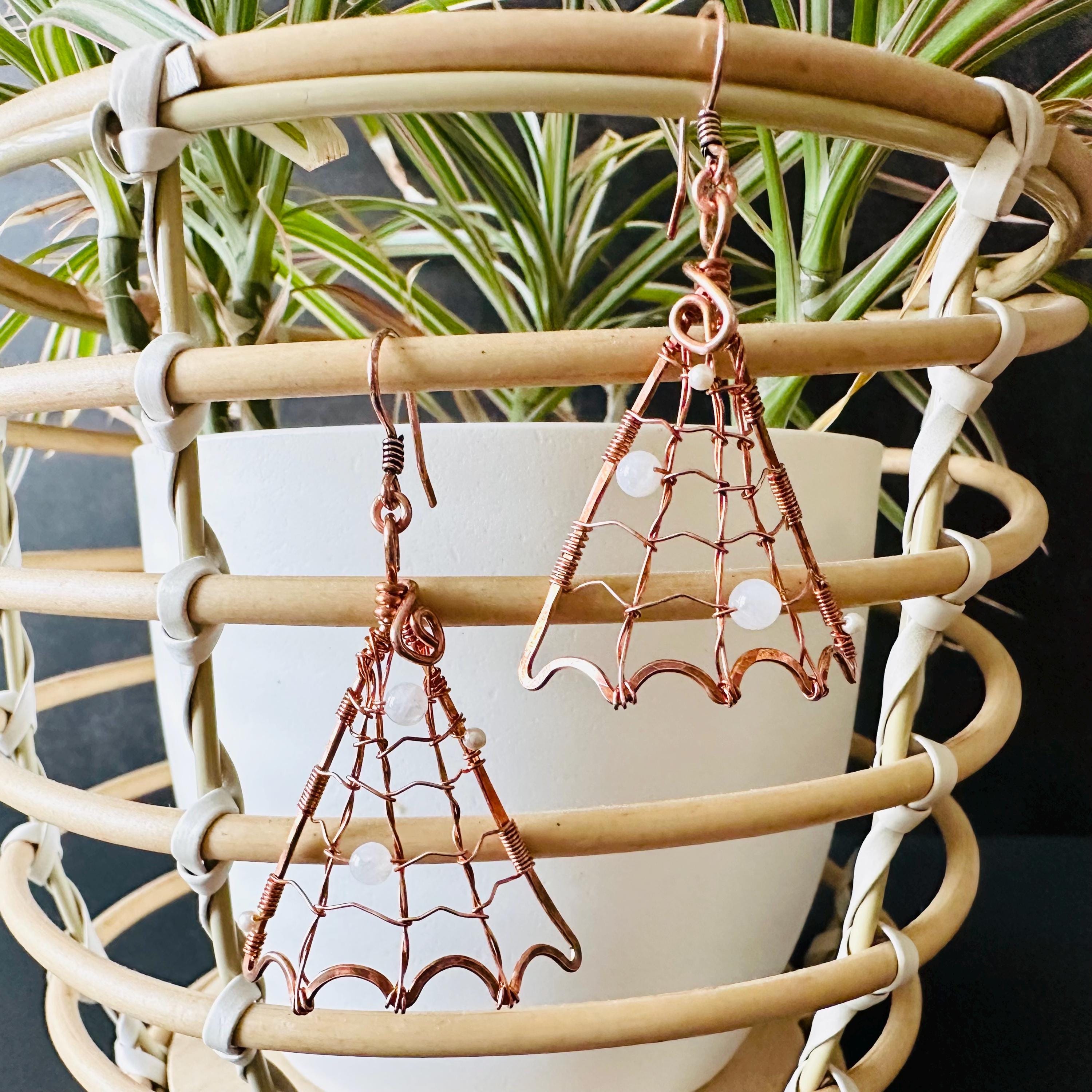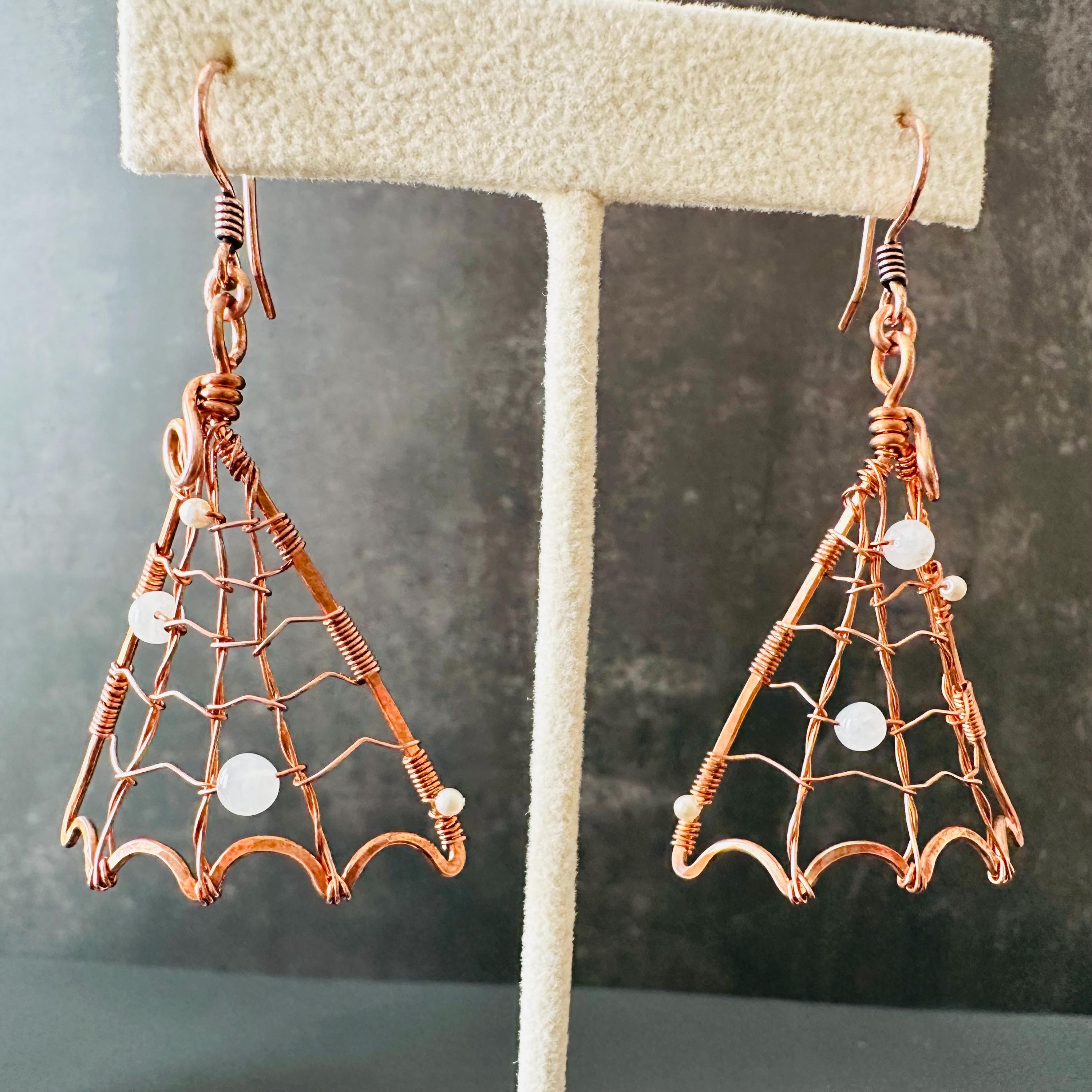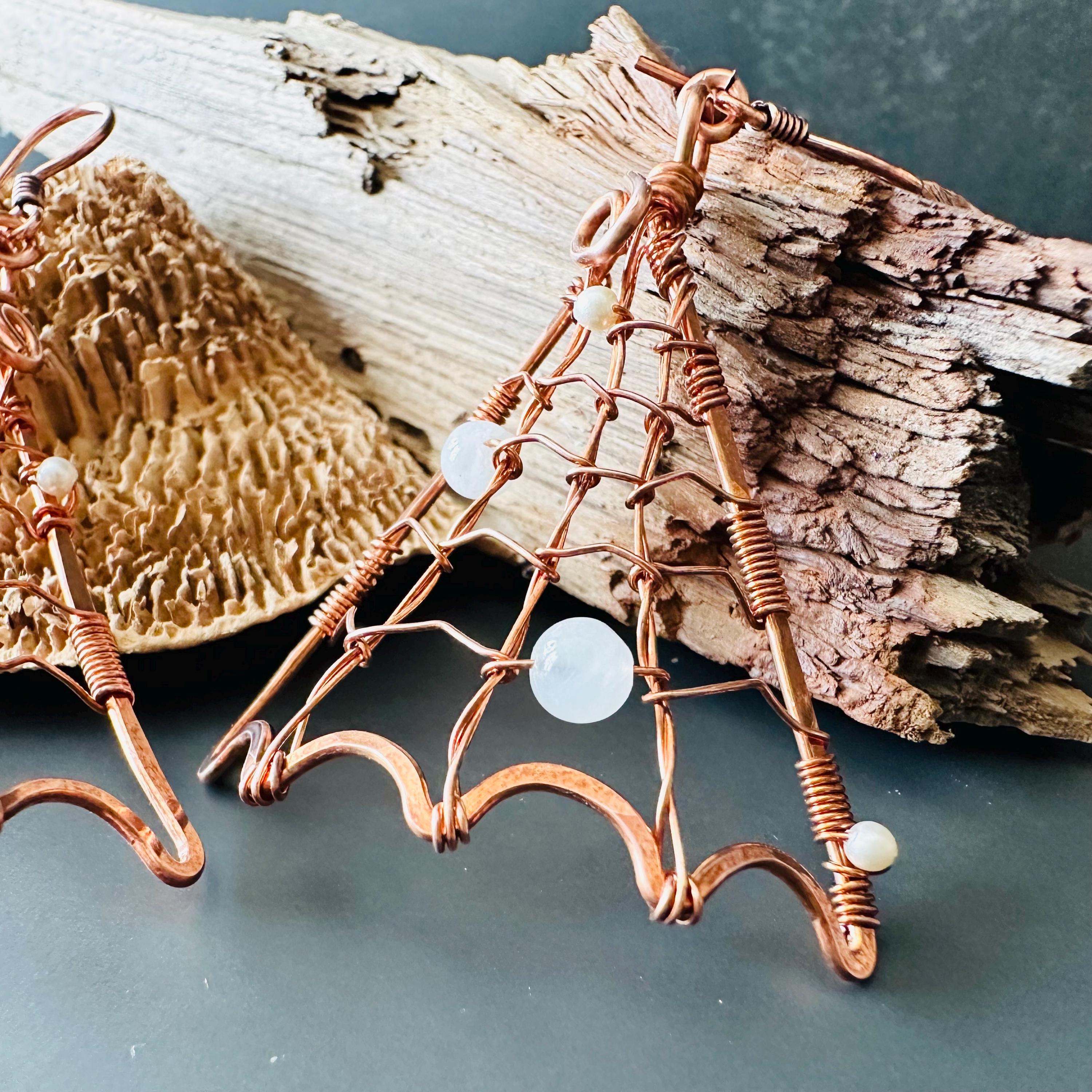 Handformed and hammered copper spider web earrings made with raw copper wire and adorned with moonstone orbs and Austrian crystal pearls.These hang just over 2.25 inches from the top of the ear wire to the bottom of the web.