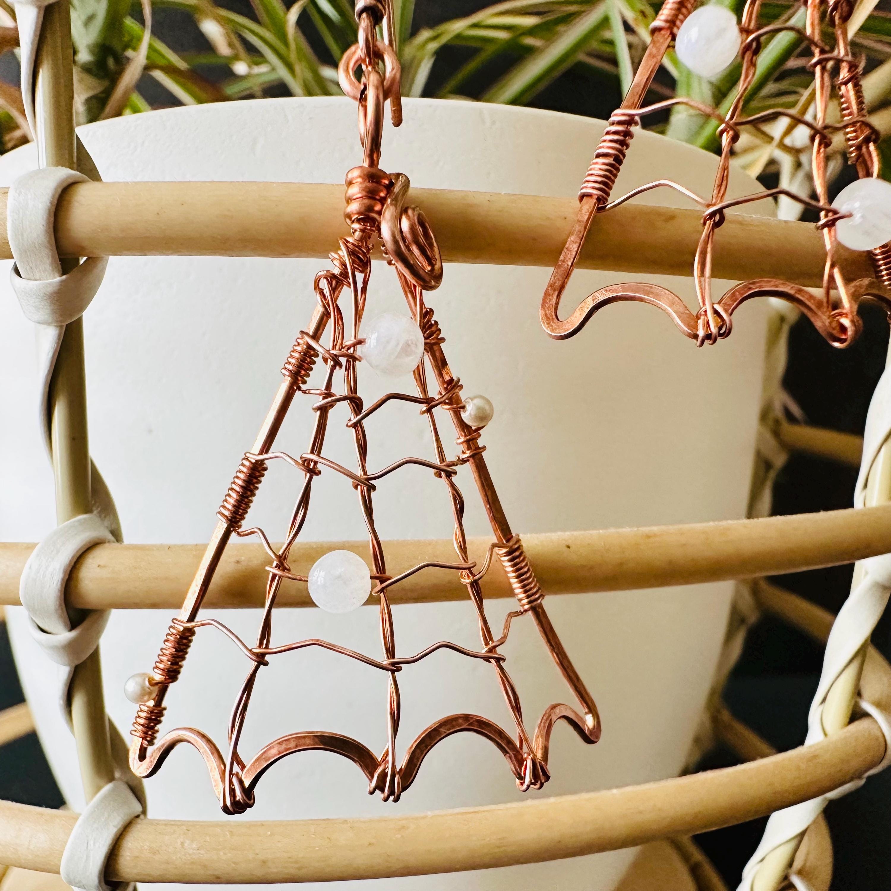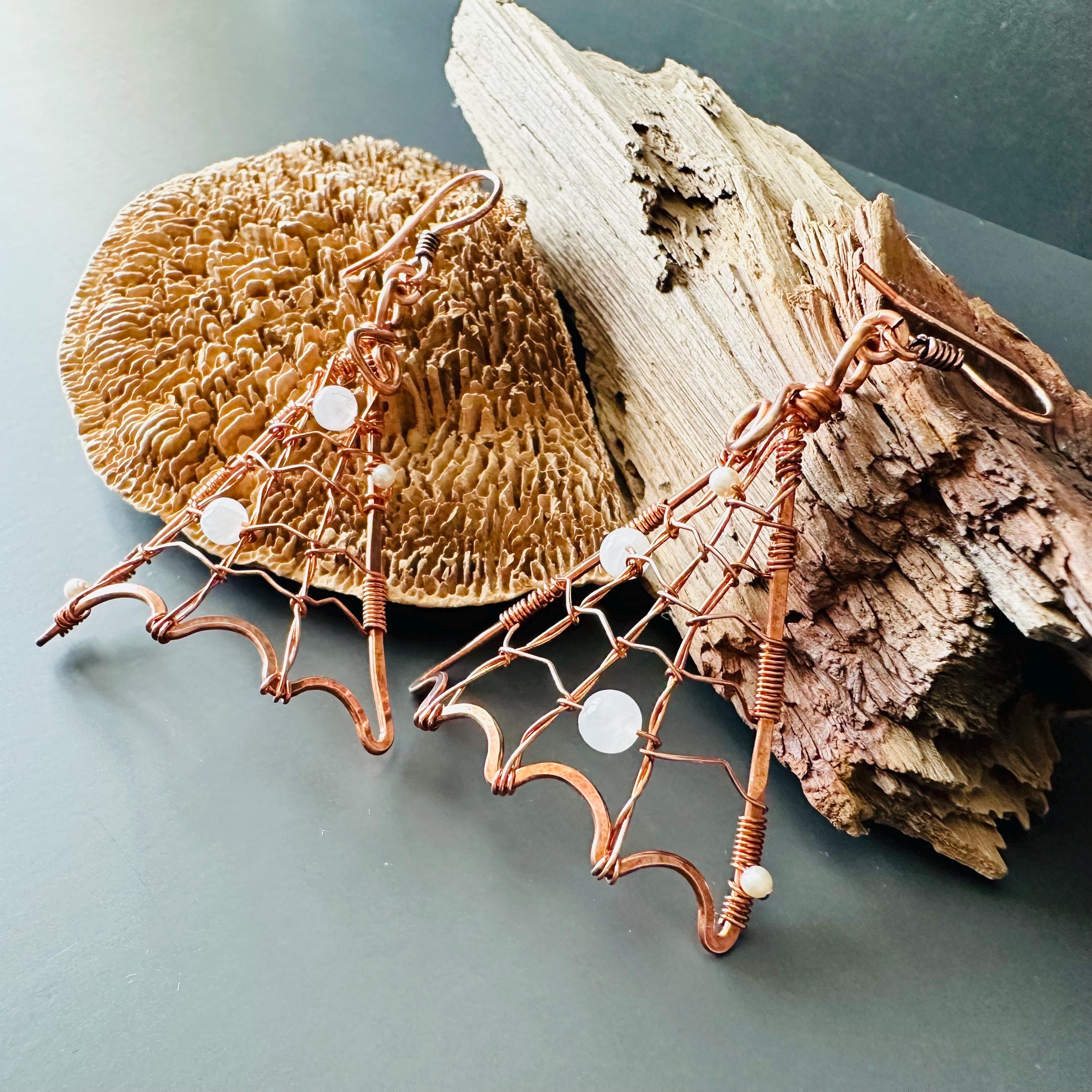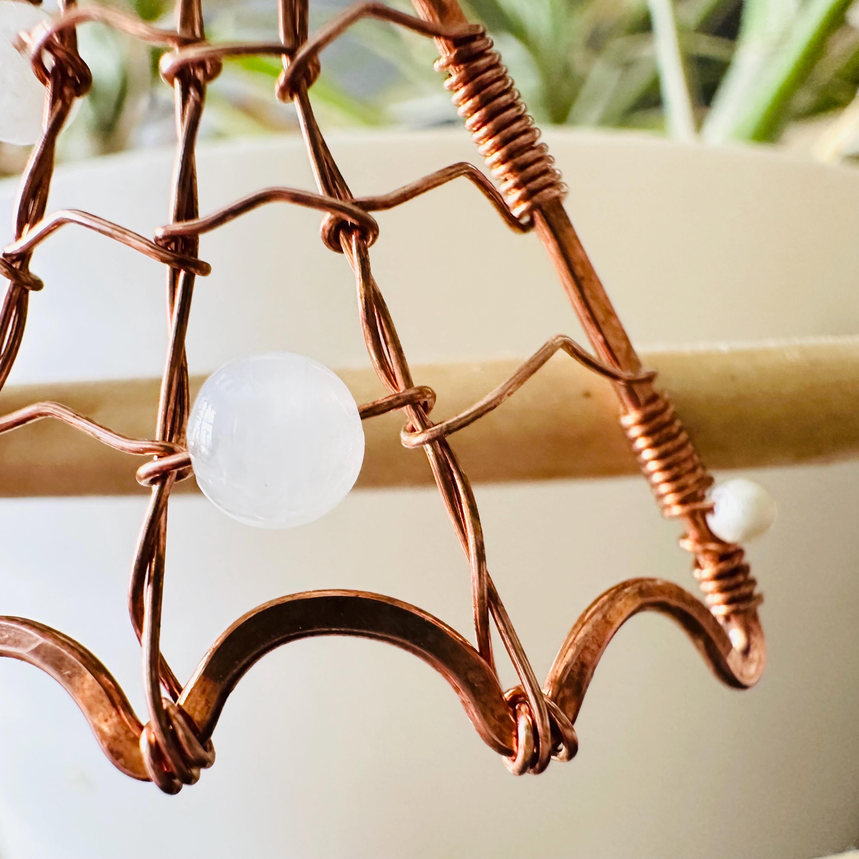 Handformed and hammered copper spider web earrings made with raw copper wire and adorned with moonstone orbs and Austrian crystal pearls.These hang just over 2.25 inches from the top of the ear wire to the bottom of the web.