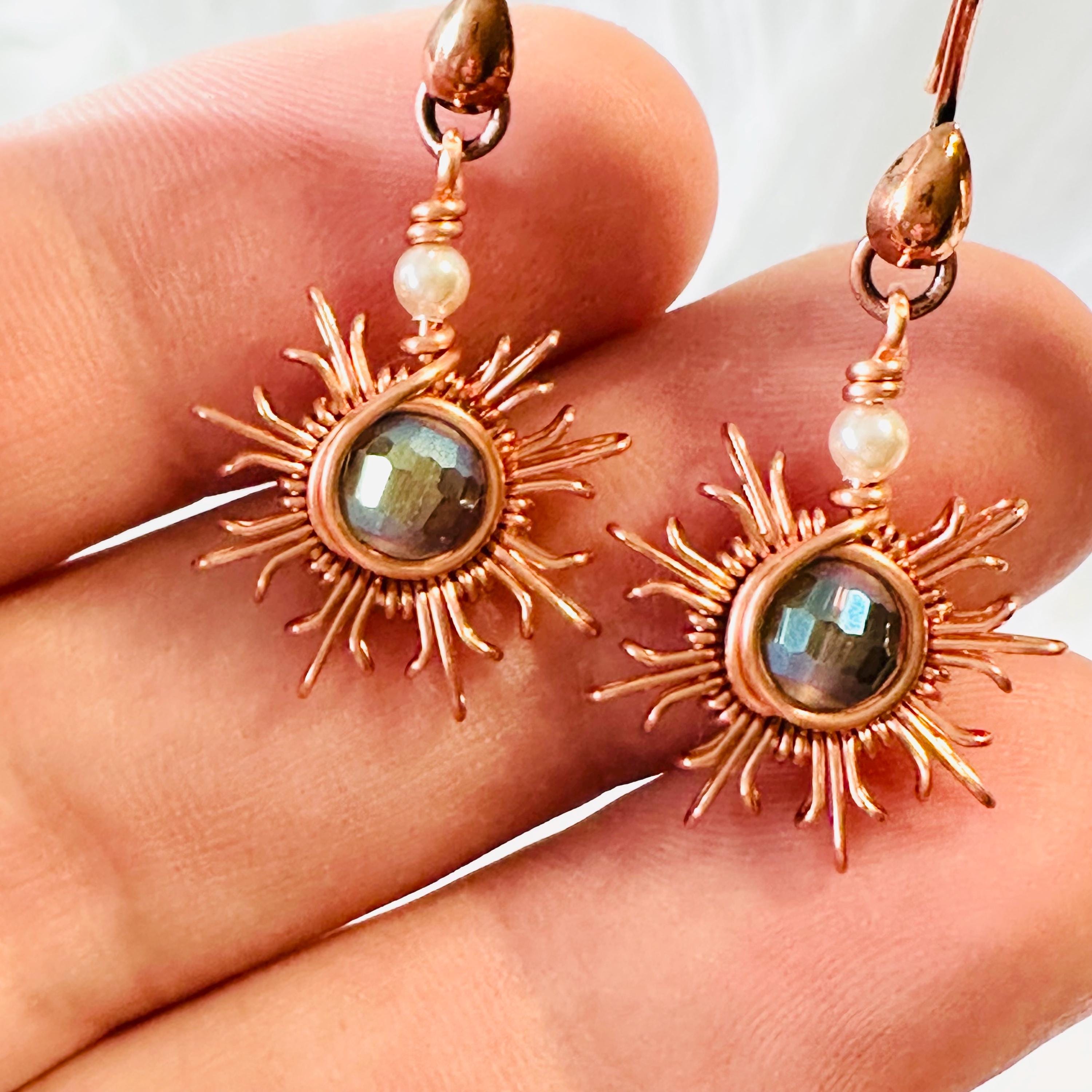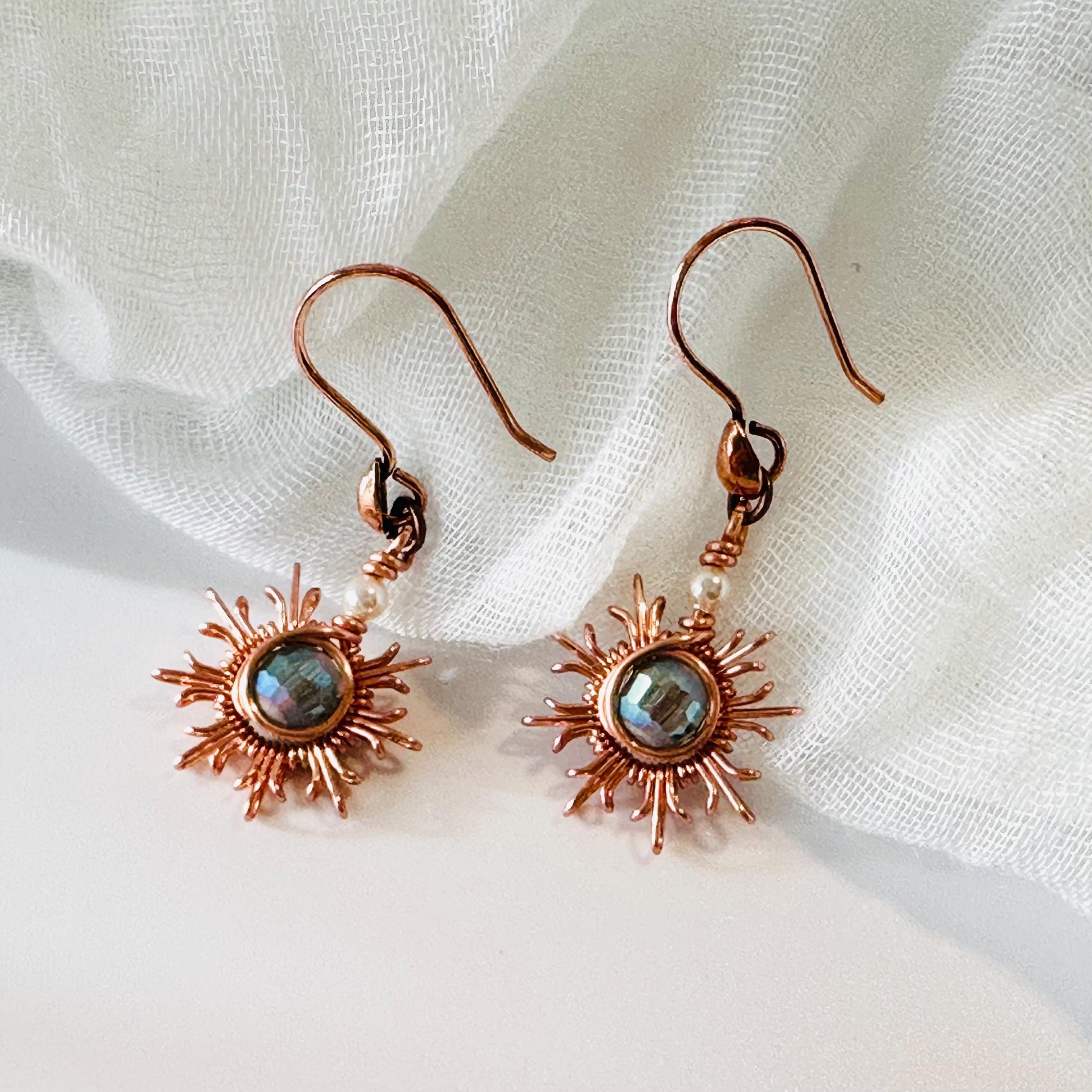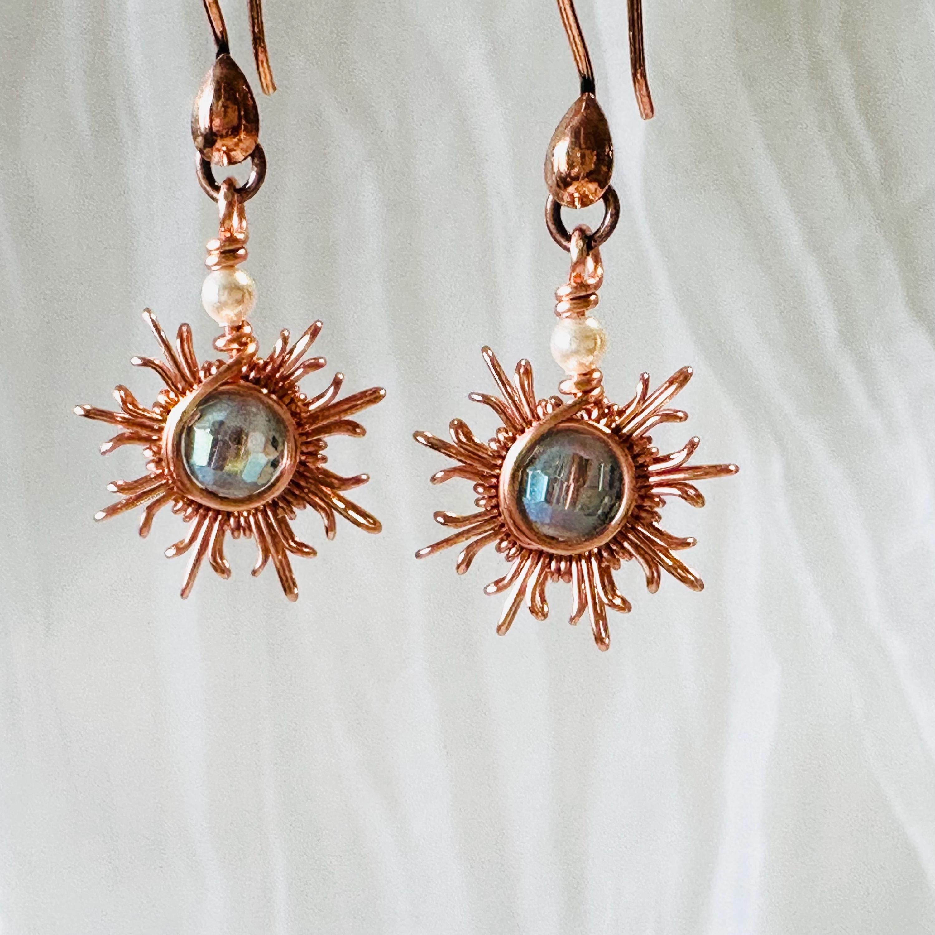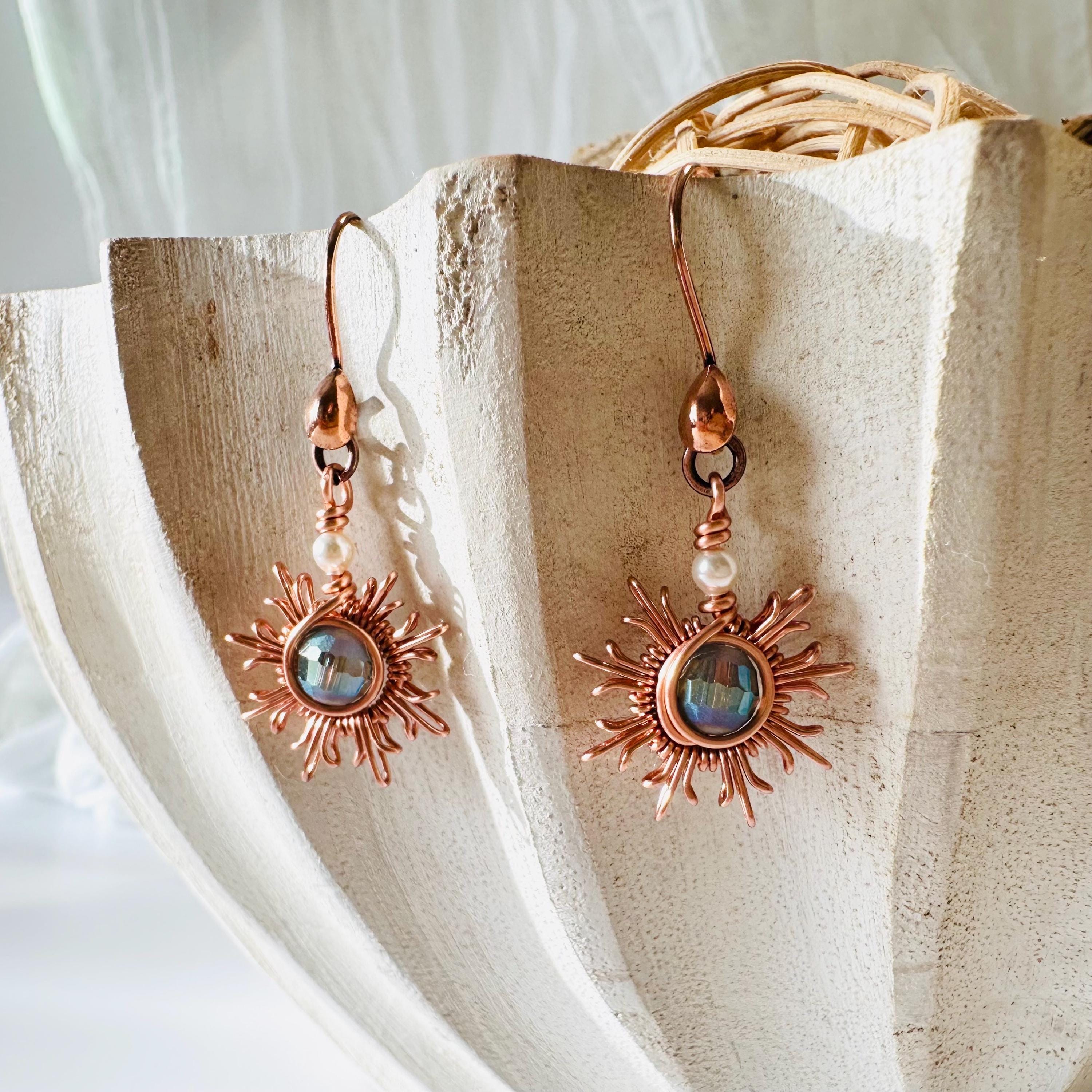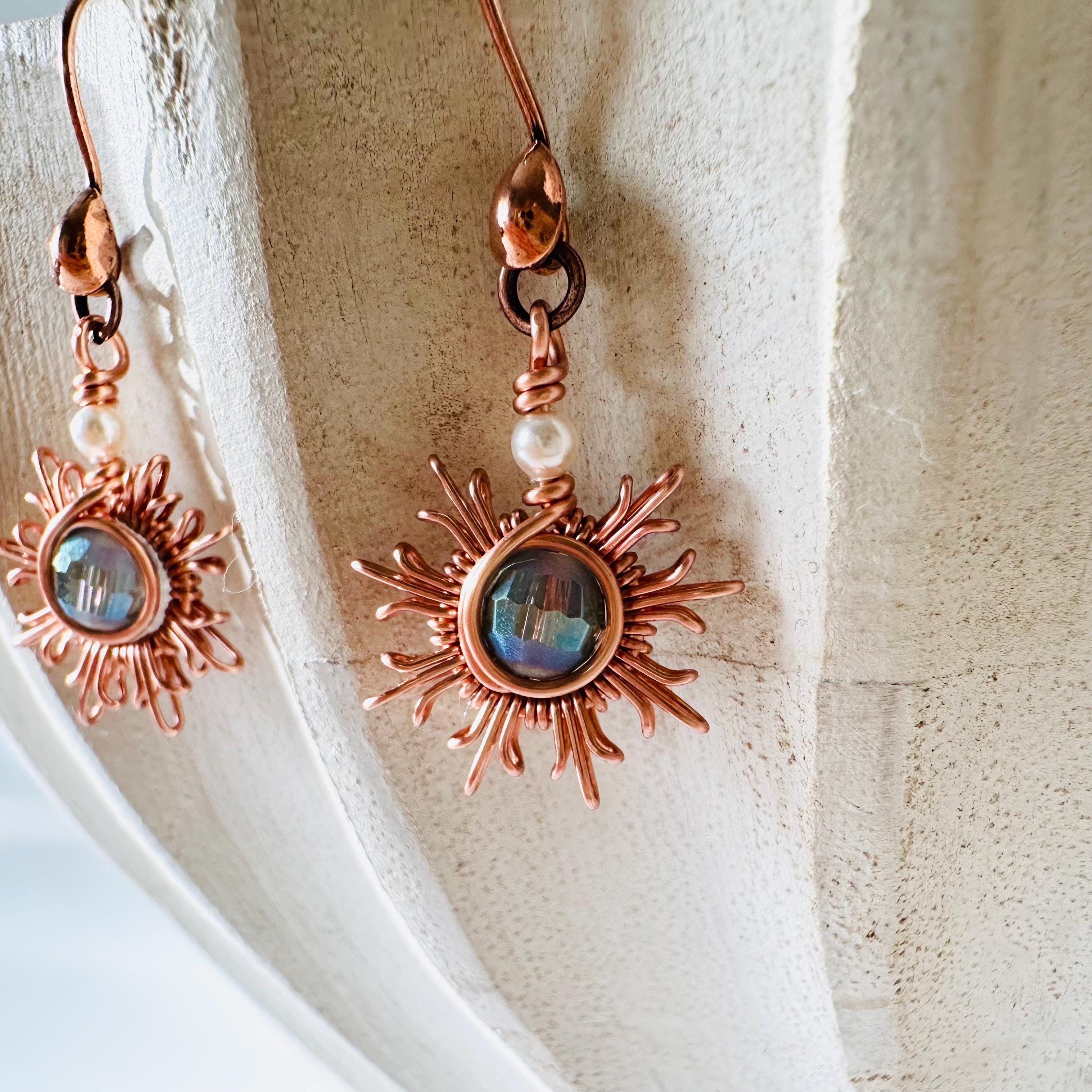 Hand-formed copper wire snowflakes with faceted glass centers.These hang 1.75 inches from the top of the ear wire to the bottom of the snowflake.Nickel-free.Hand-crafted in Gardners, Pennsylvania.
