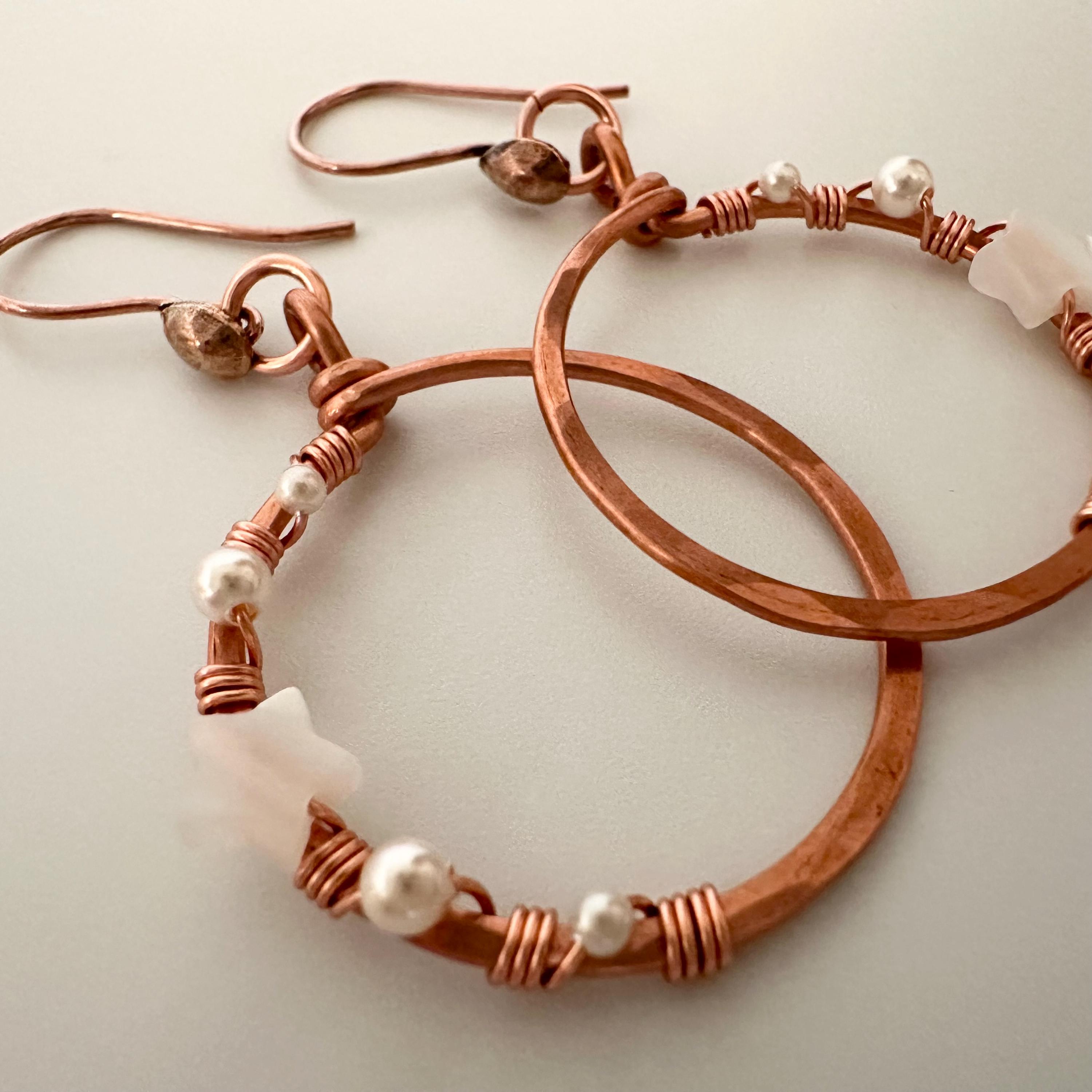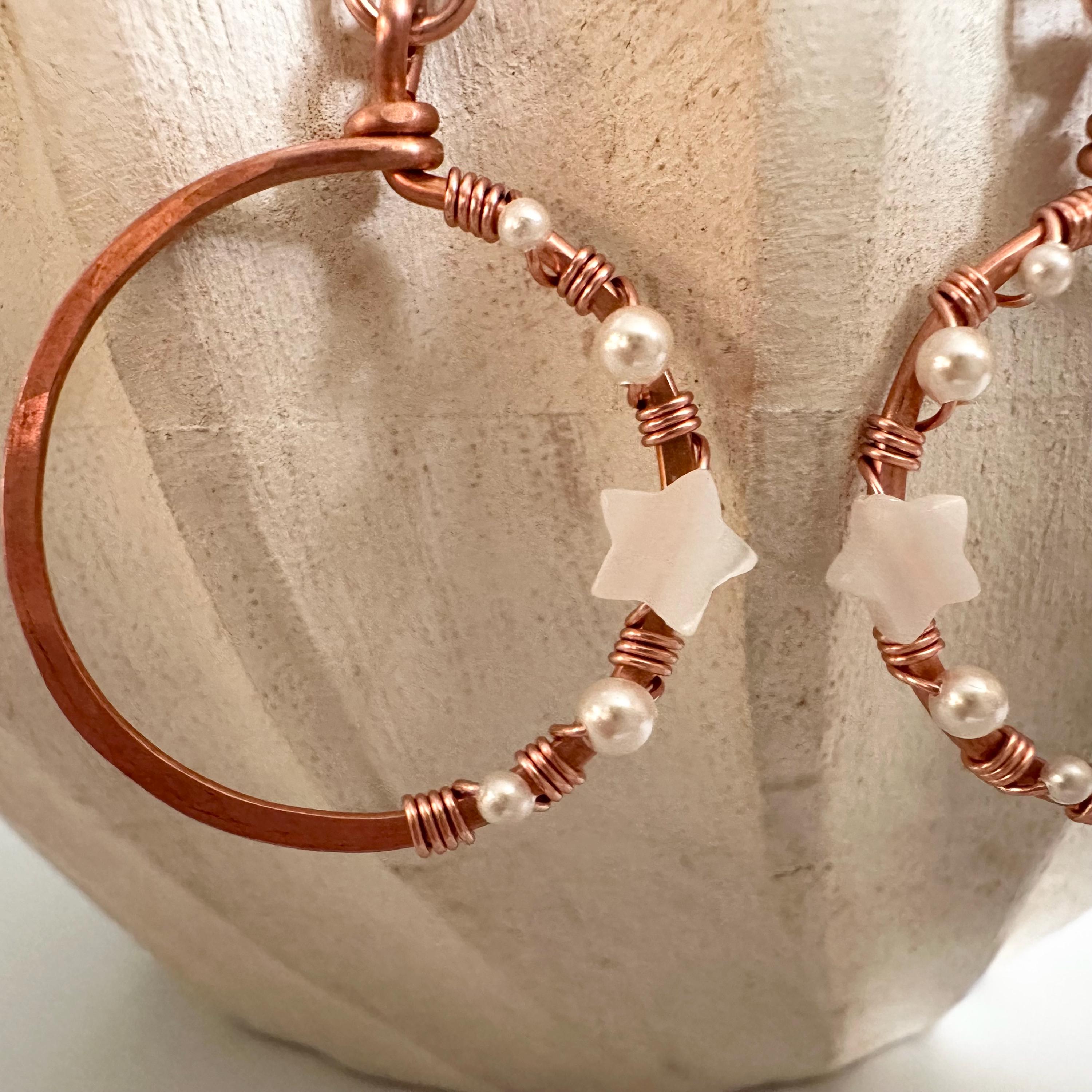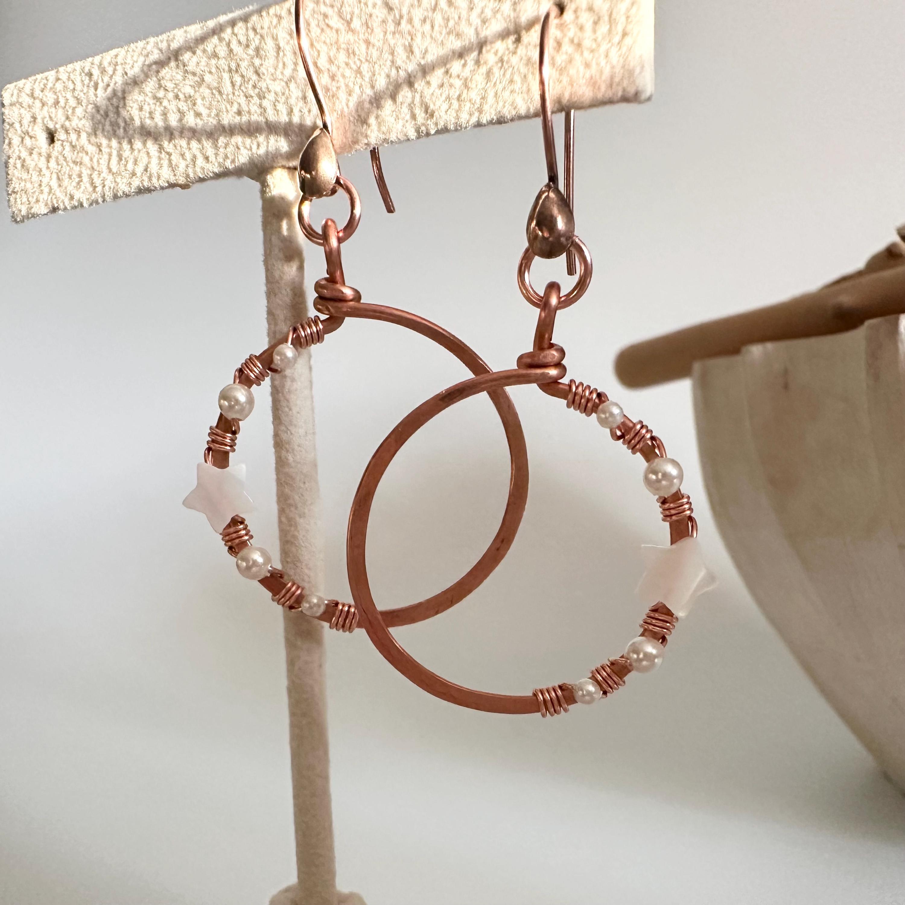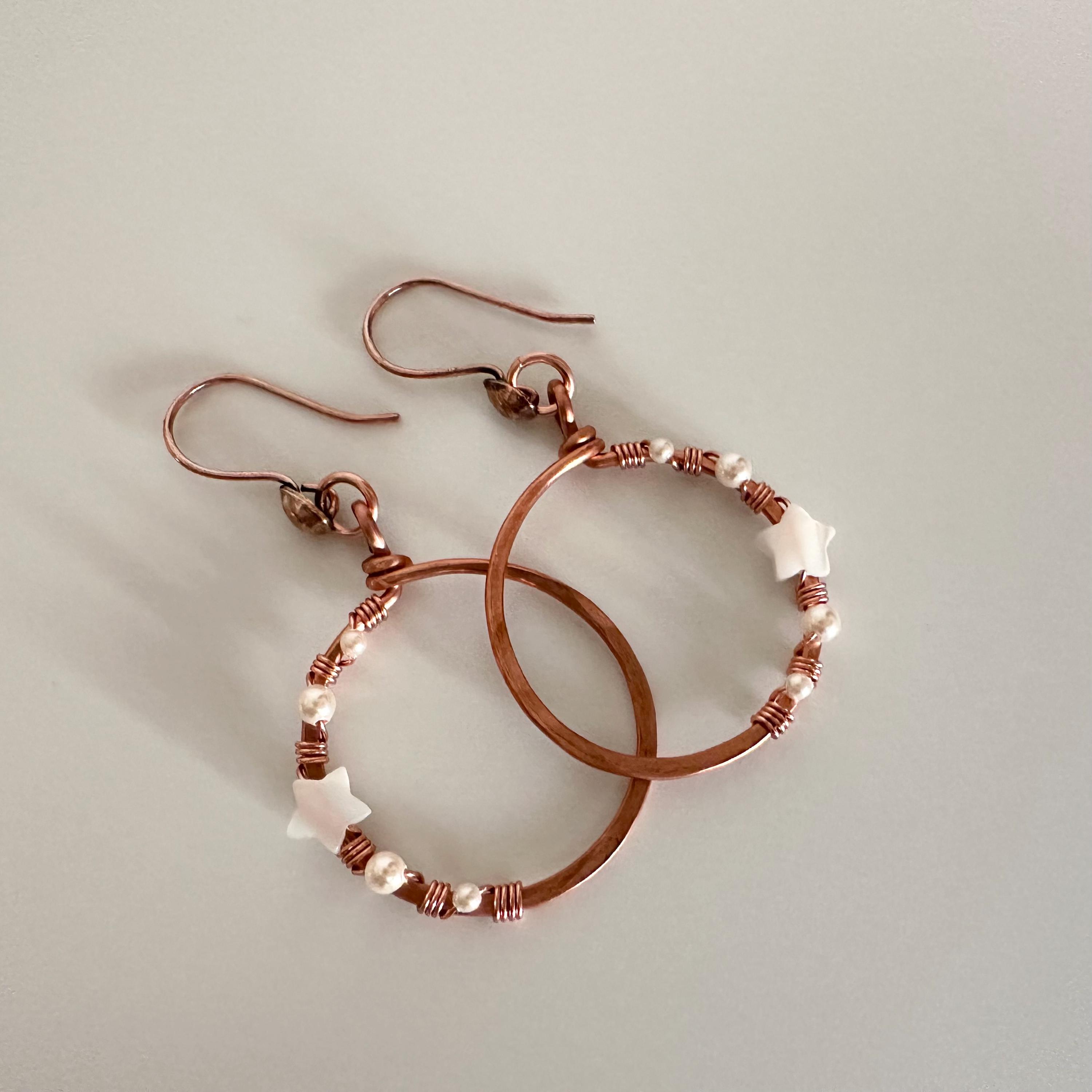 Neutral beachy and celestial vibes earrings hand-formed and hammered with copper wire. Adorned with adorable Mother of Pearl stars and Austrian Crystal Pearls.These hang just over 2 inches from the top of the ear wire to the bottom of the earring.