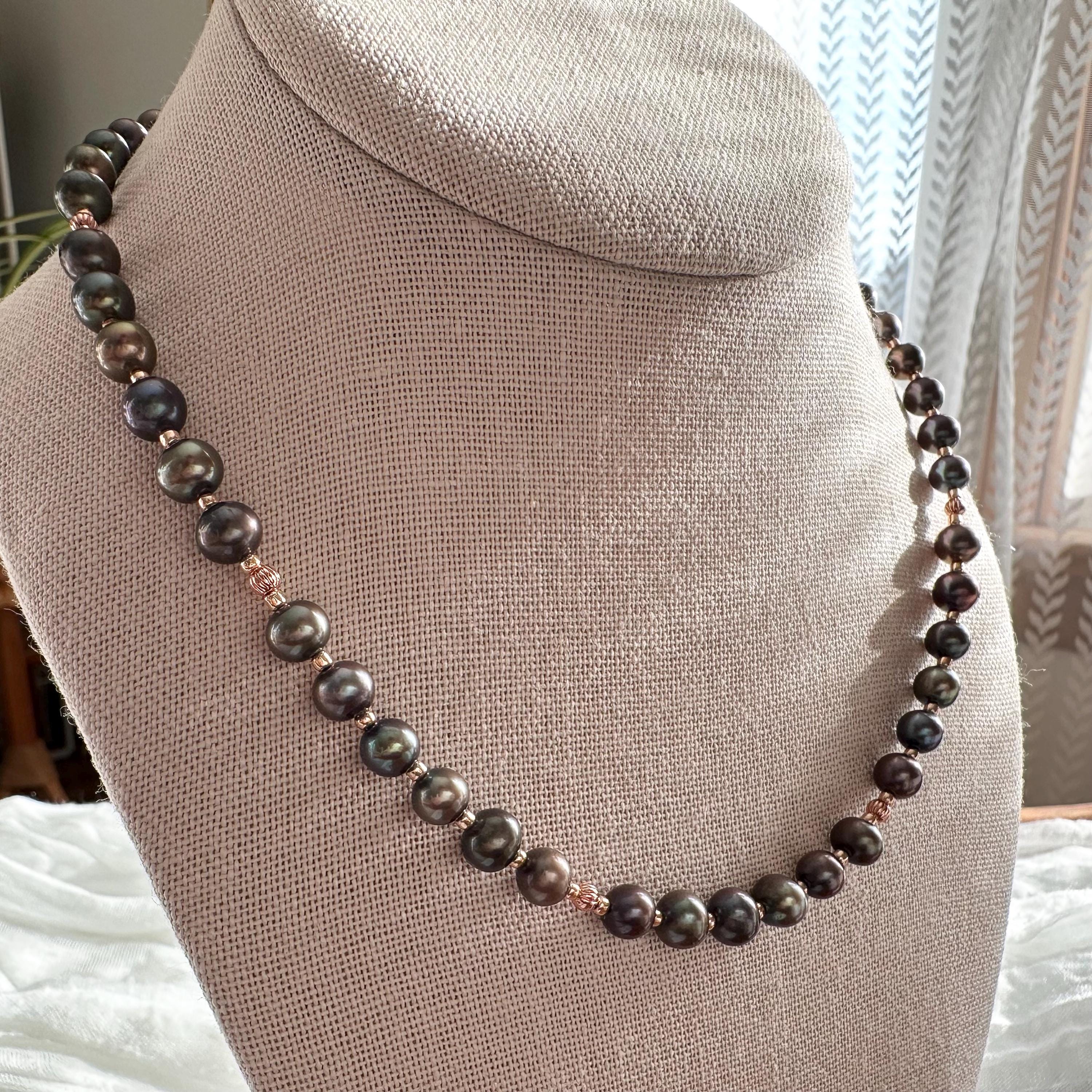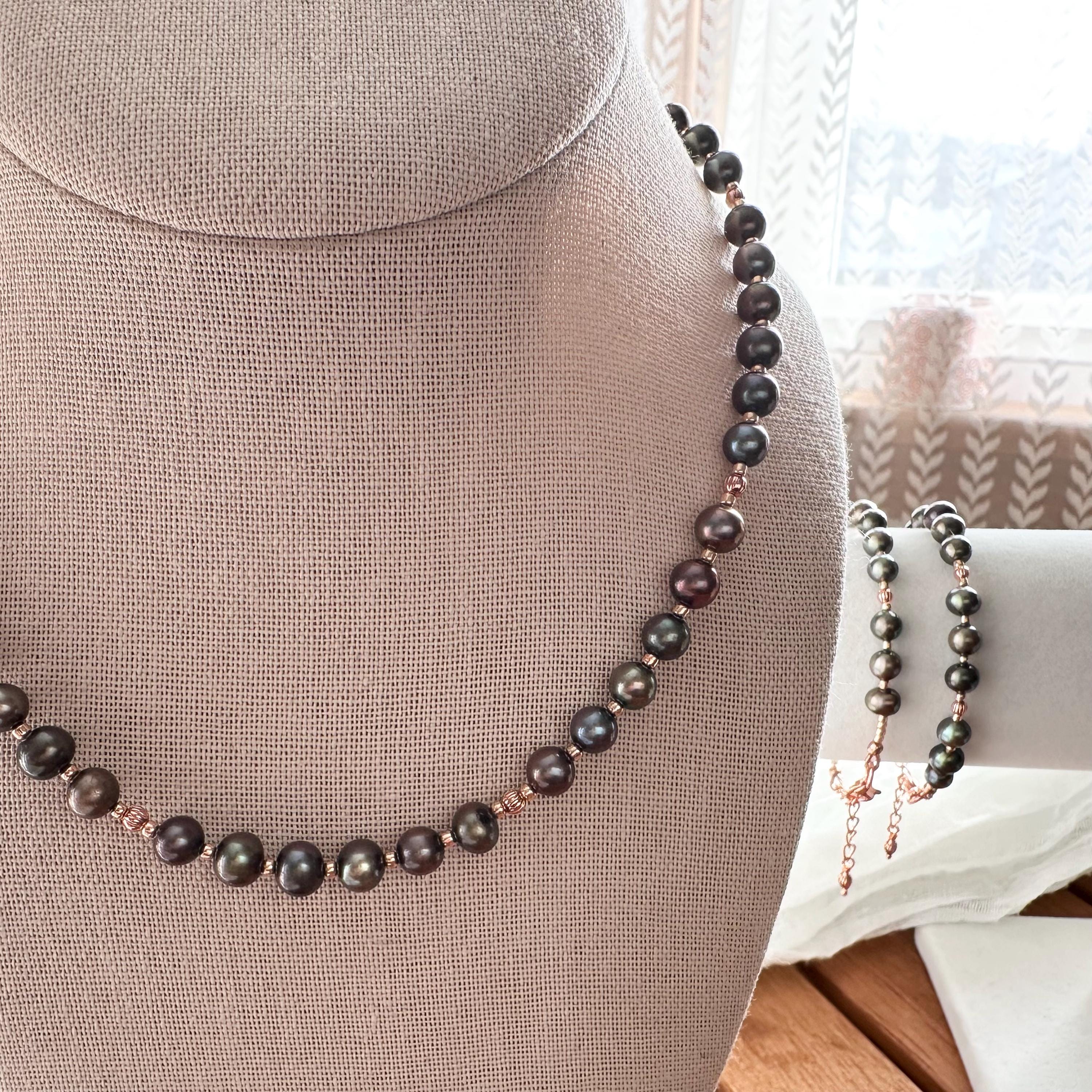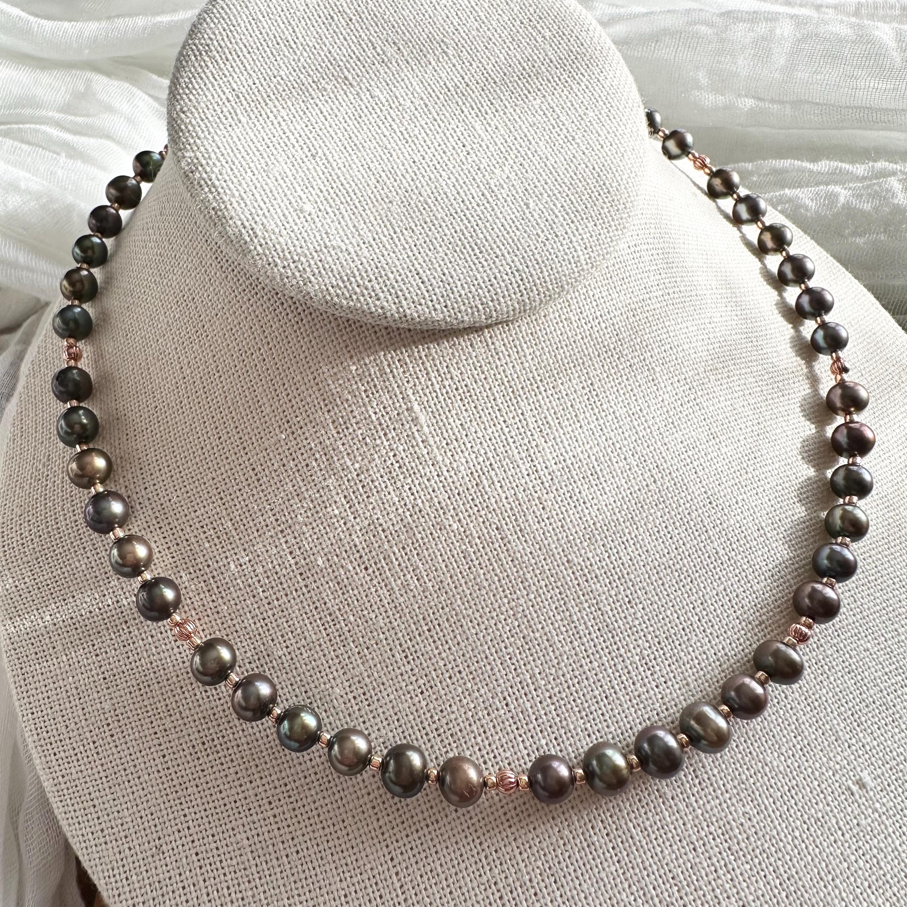 Gorgeous deep green freshwater pearls and copper beads with complimentary rose-gold colored seed beads complete this necklace. All strung on sturdy and durable 49-strand stainless steel wire with a copper-colored coating to blend seamlessly.