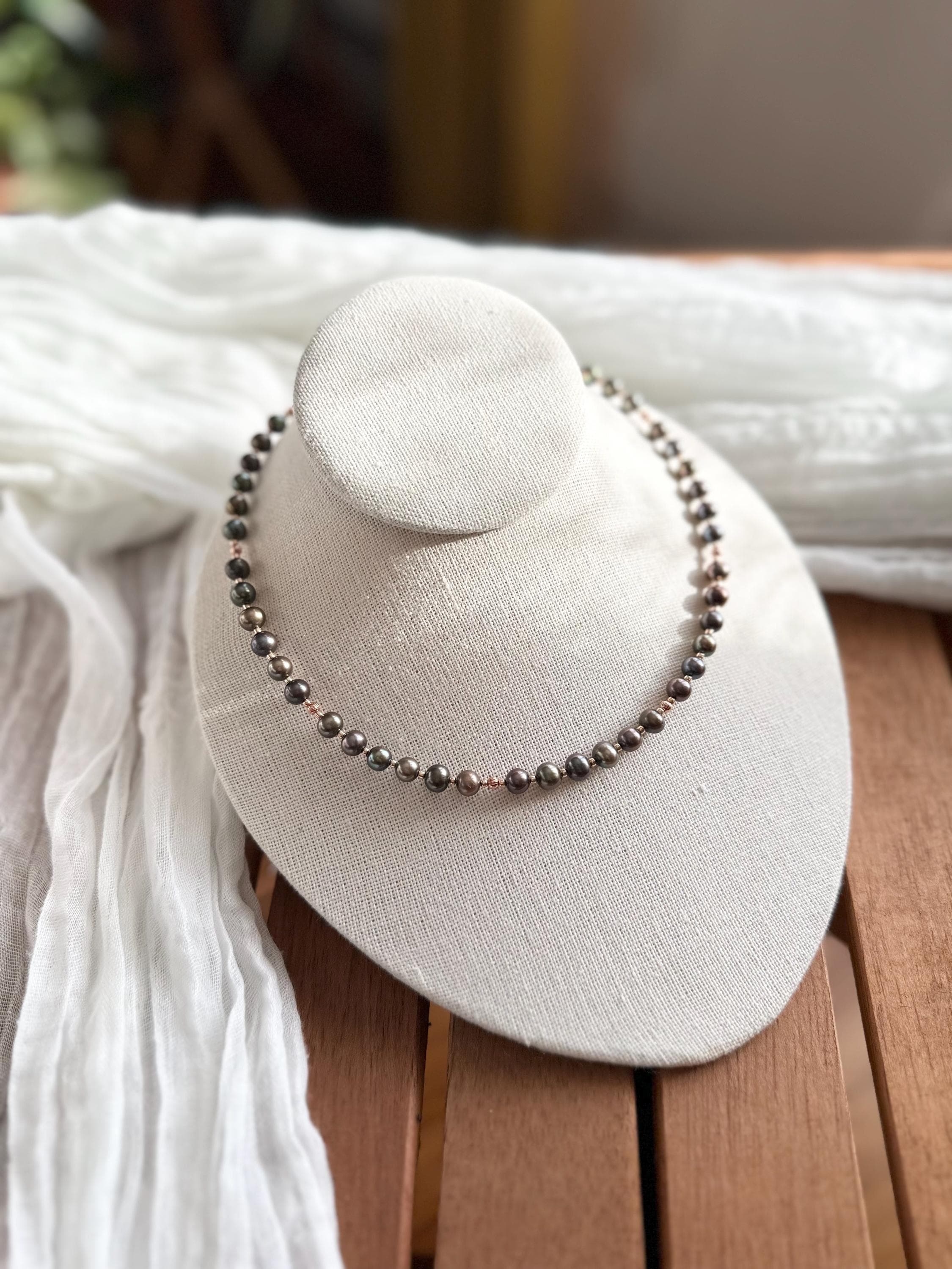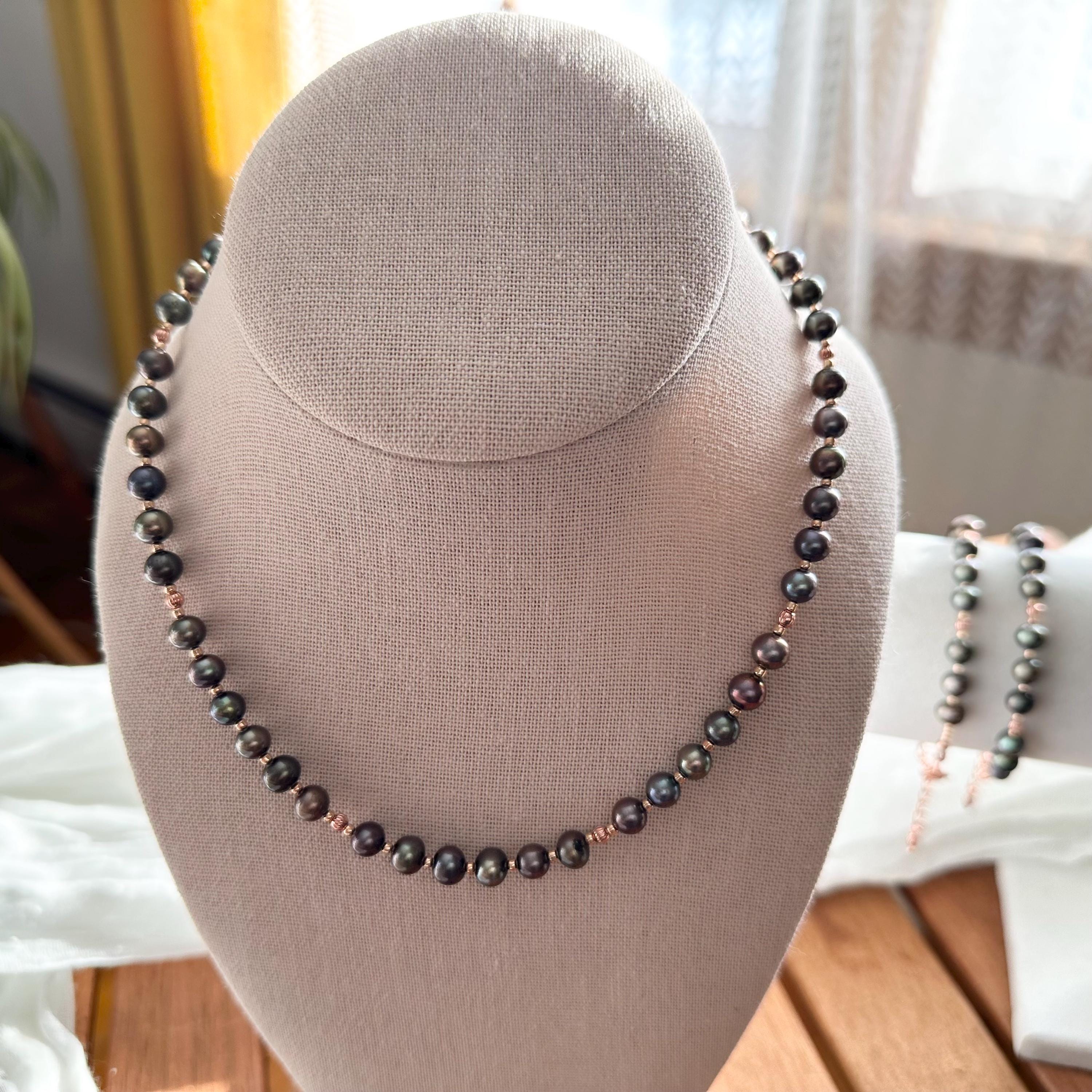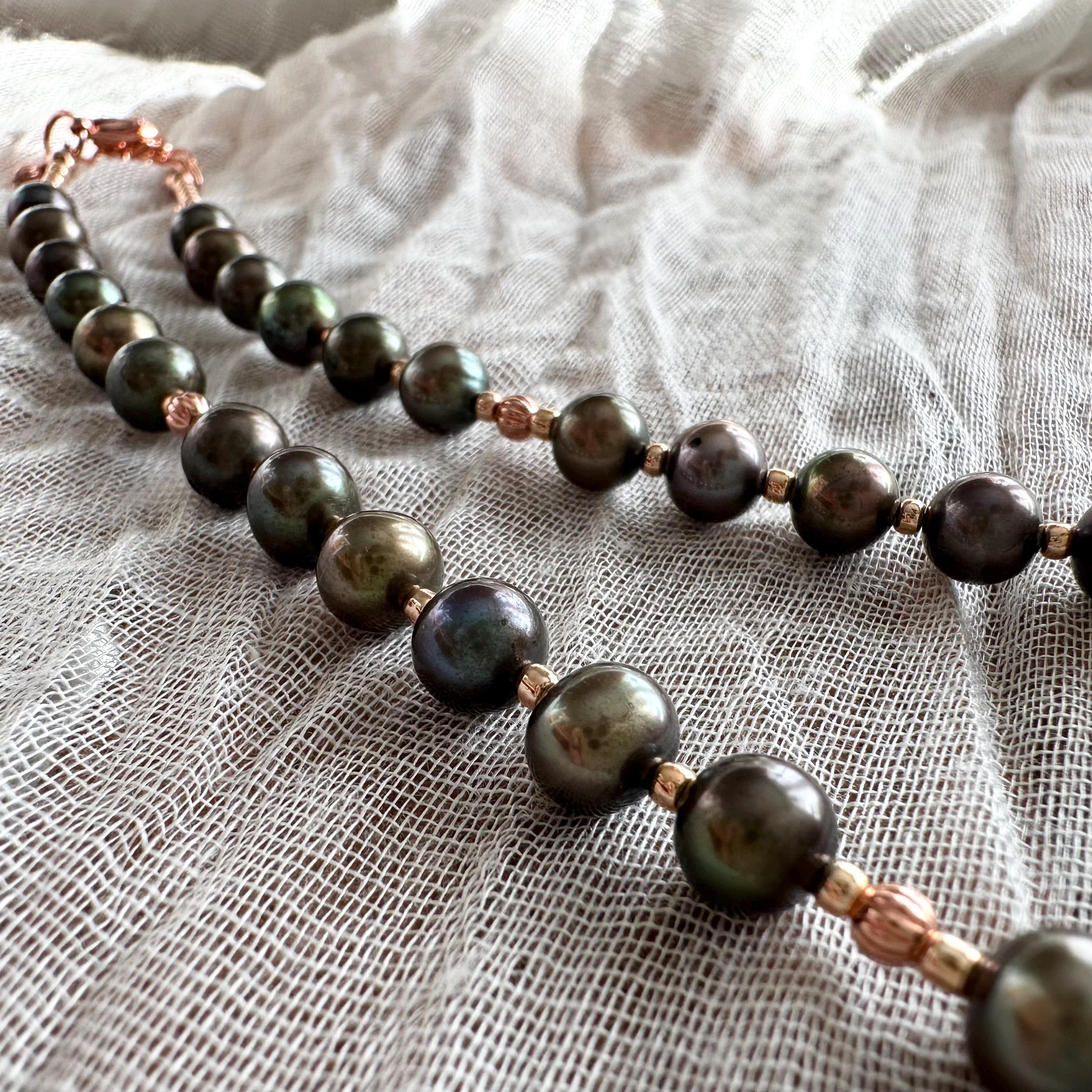 Gorgeous deep green freshwater pearls and copper beads with complimentary rose-gold colored seed beads complete this necklace. All strung on sturdy and durable 49-strand stainless steel wire with a copper-colored coating to blend seamlessly.