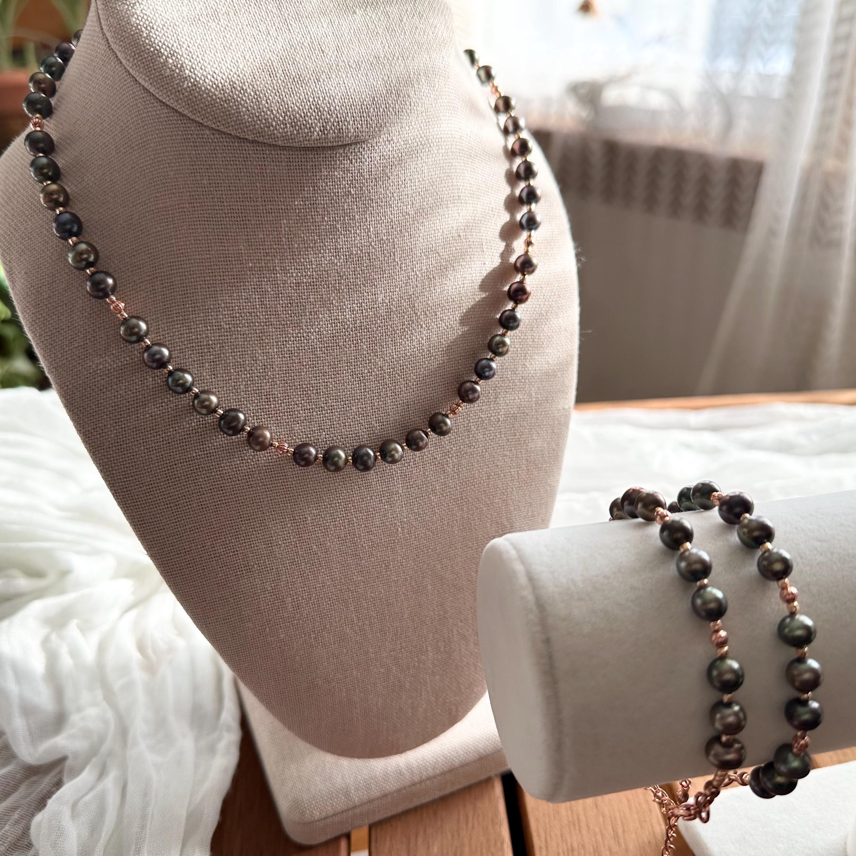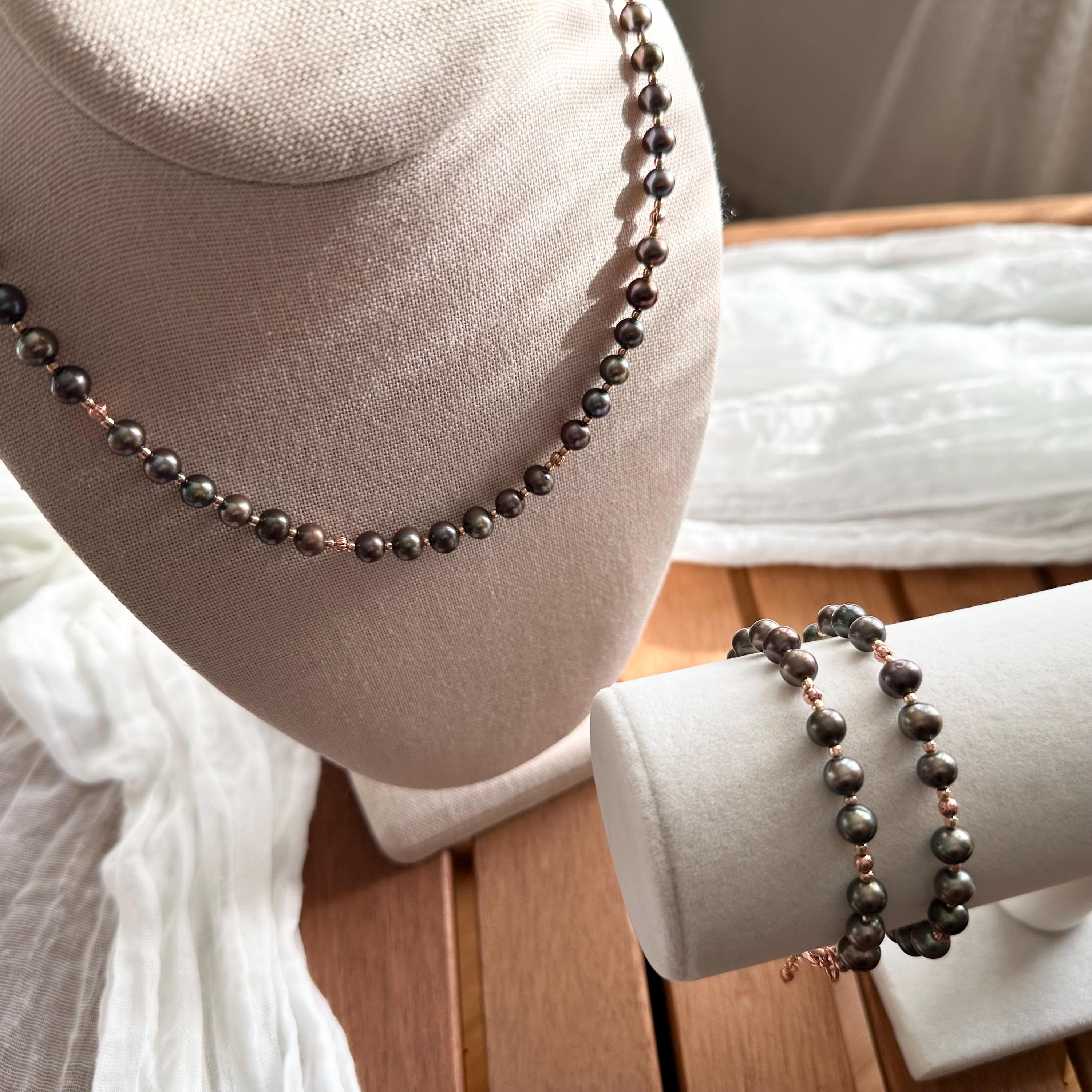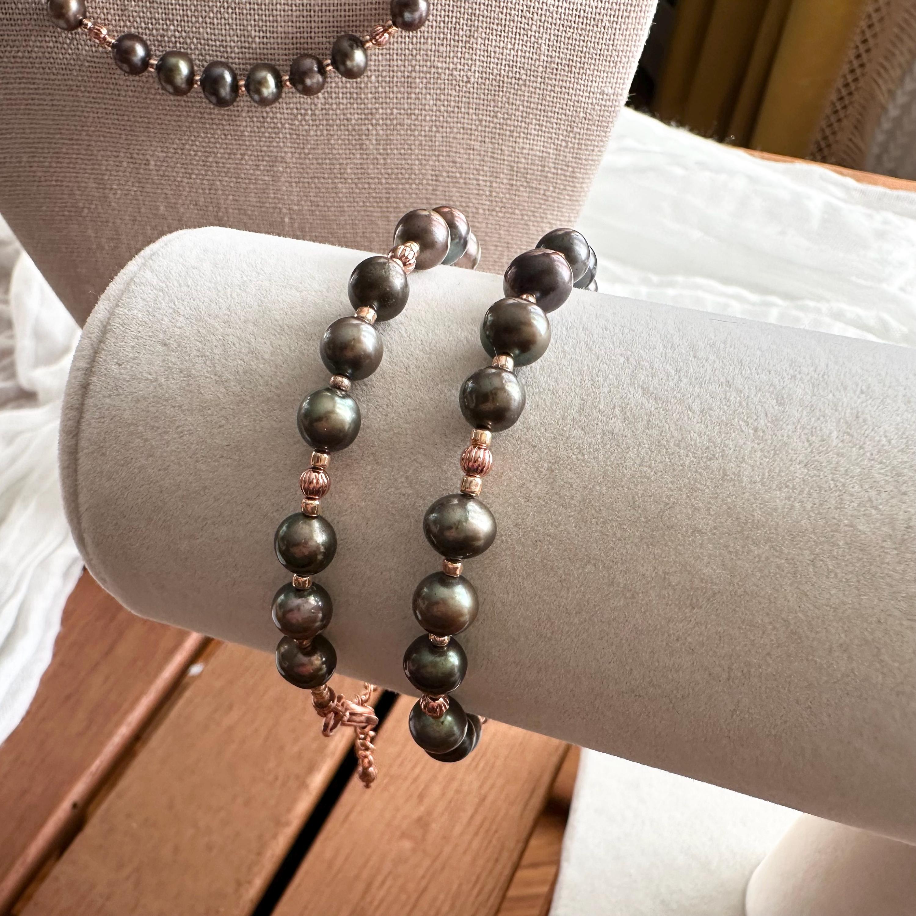 Gorgeous deep green freshwater pearls and copper beads with complimentary rose-gold colored seed beads complete this bracelet. All strung on sturdy and durable 49-strand stainless steel wire with a copper-colored coating to blend seamlessly.