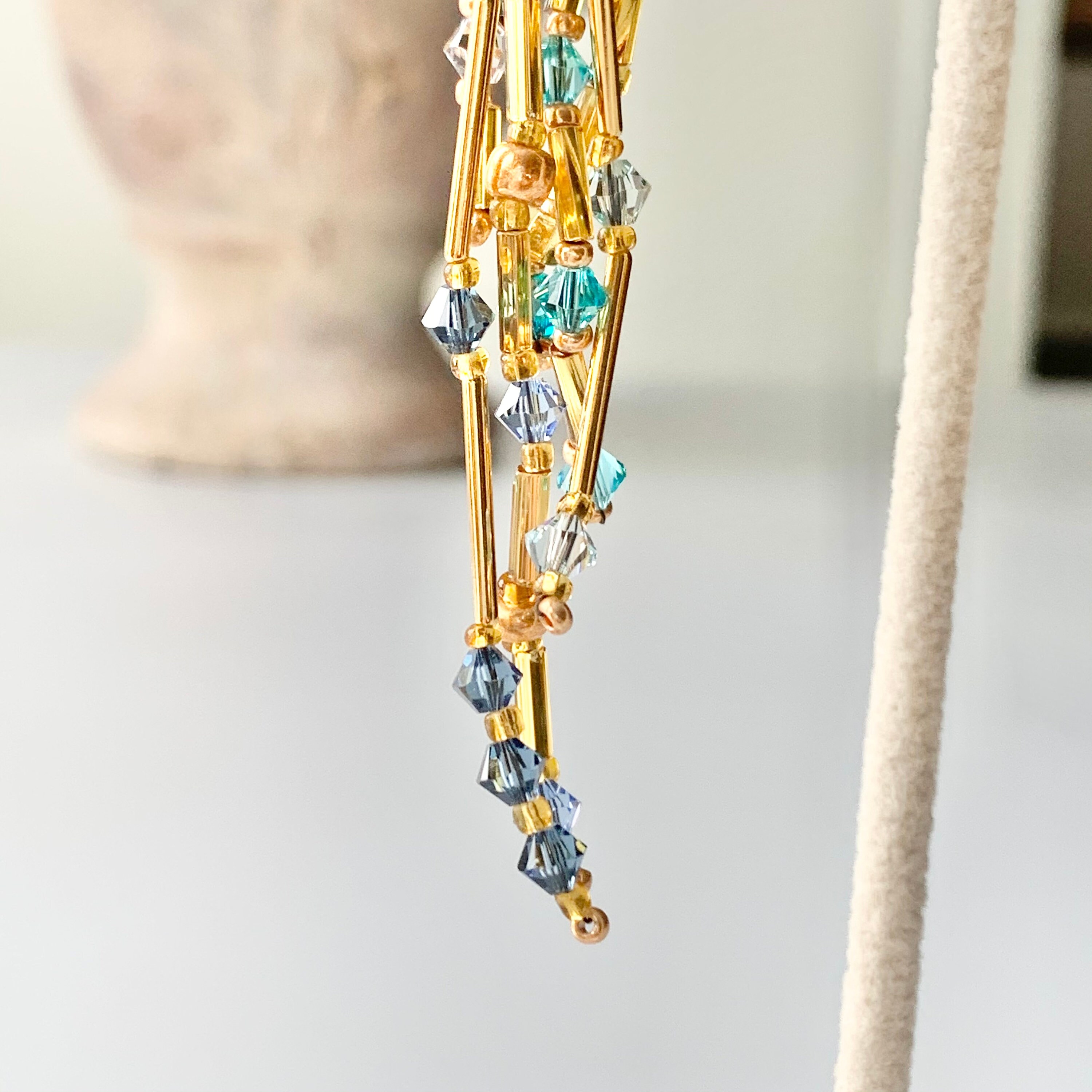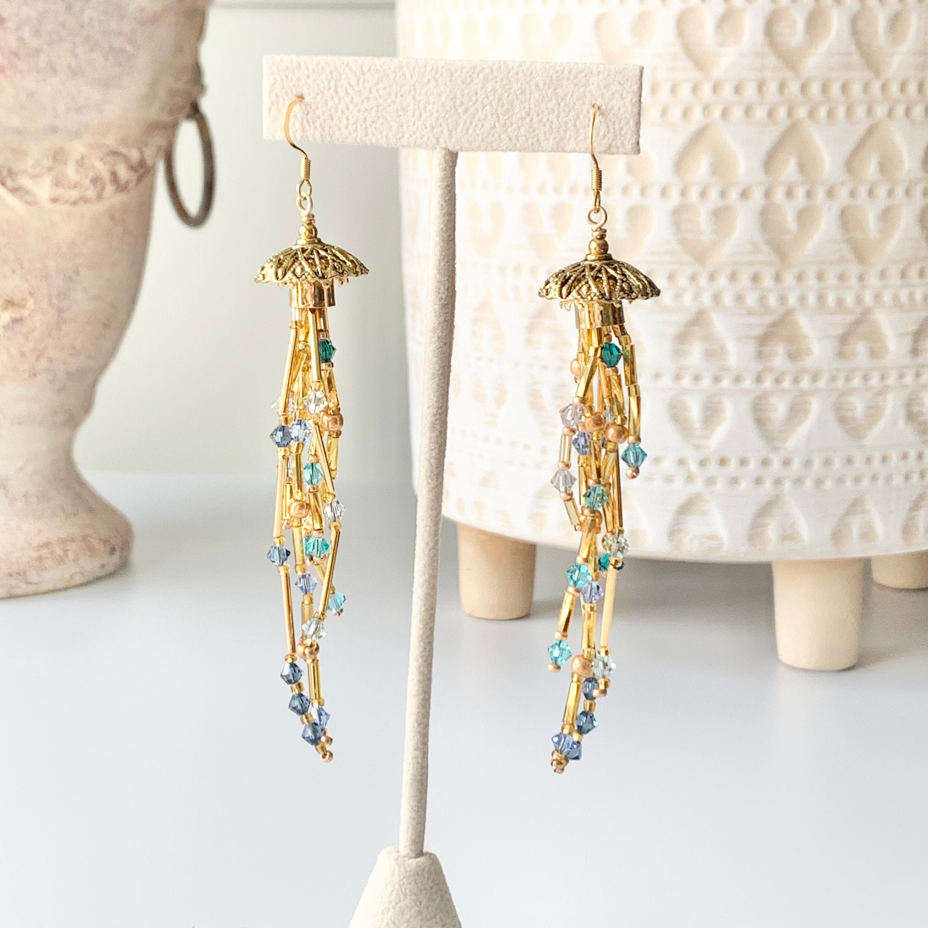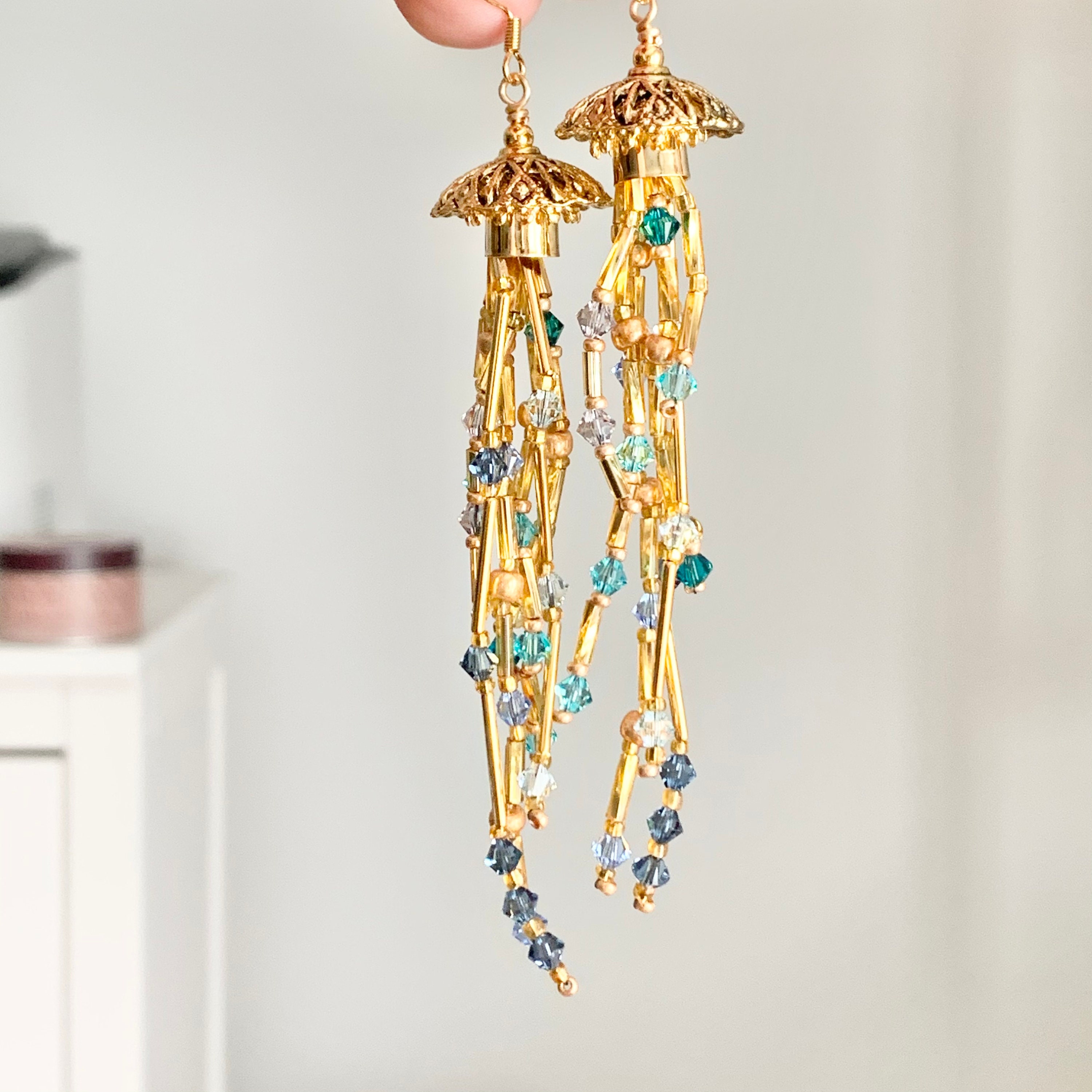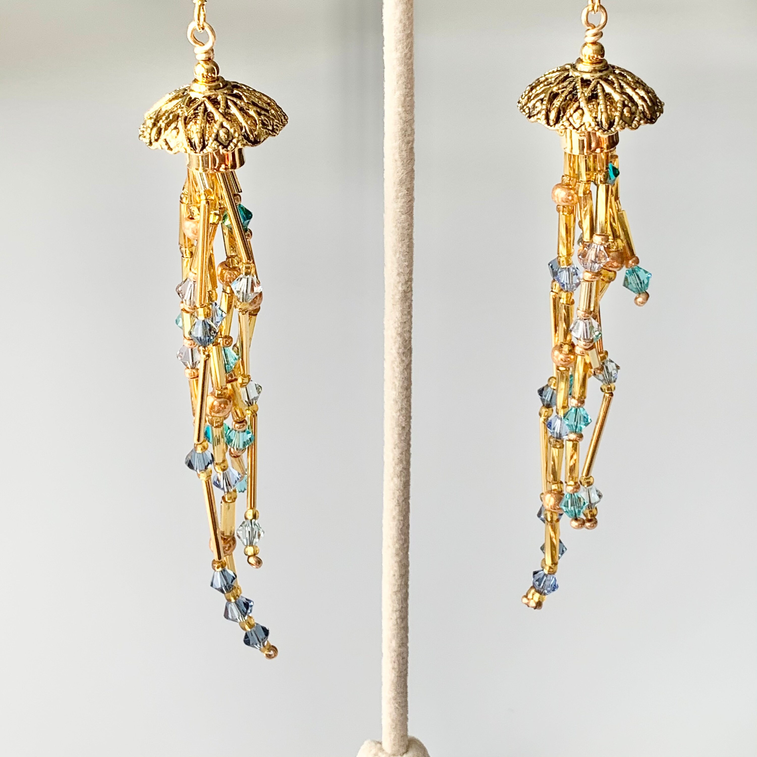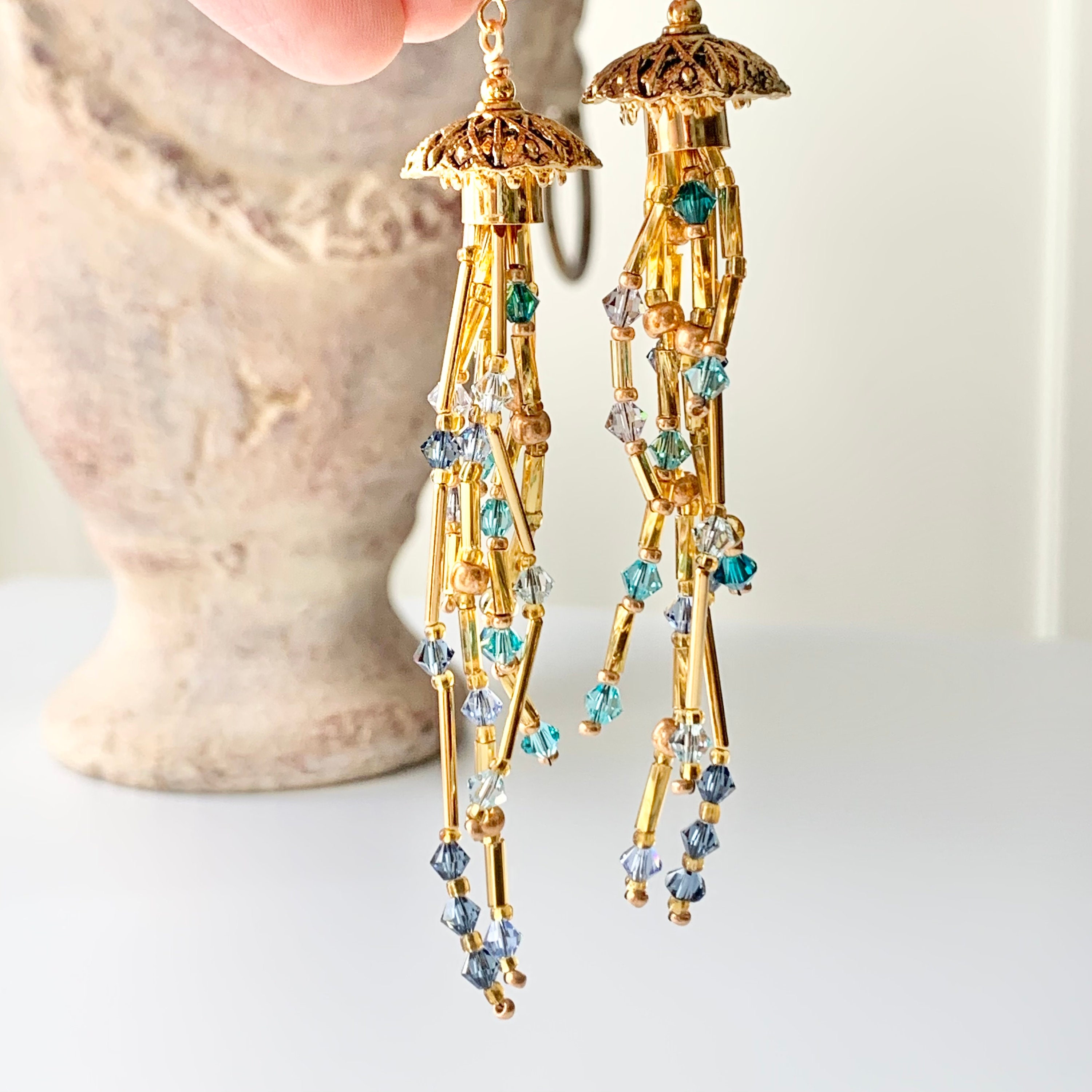 These gorgeous flowing gold jellyfish earrings are a must have for the ocean-lover! Each pair I create is completely unique and never recreated in color/pattern. This unique pair is accented with multiple tones of tranquil blue colored Swarovski crystal bicones to help them really dazzle in the light! Each earring has 7 “tentacles” in various lengths to mimic the appearance of jellyfish moving through water. However, each pair has identical tentacles to ensure they are the same weight/length so you won’t feel lop-sided wearing them.